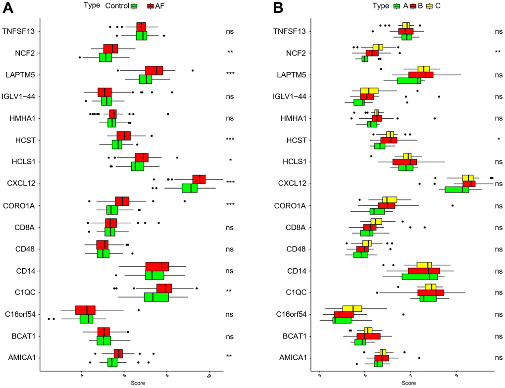 Currently, the NCF2 gene and its genetic variants have been reported to be associated with susceptibility to a variety of inflammation- or immune-related diseases. Cunninghame et al. found that rs10911363, an intronic variant in the NCF2 gene, was associated with systemic lupus erythematosus (SLE) susceptibility in a European population [30]. Jiao et al. proved that the rs10911362 variant in the NCF2 gene was correlated with decreased tuberculosis and pulmonary tuberculosis susceptibility in a Chinese population [31]. In addition, Li et al. suggested that the NCF2 gene is expected to become a molecular marker for the diagnosis of pulmonary tuberculosis, and its expression was significantly increased in patients with pulmonary tuberculosis [32]. Su et al. found that the NCF2 gene was significantly overexpressed in advanced atherosclerotic plaques and may play a key role in the development of psoriasis complicated with atherosclerosis [33]. Moreover, some scholars have found that NCF2 may be a key molecule in patients with nonalcoholic fatty liver disease complicated with AF [34], and the expression of NCF2 is significantly upregulated in patients with AF [35]. On the other hand, Zhou et al. found that overexpression of immune-related genes, such as HCST, was significantly correlated with high infiltration of immune cells, especially dendritic cells, in clear cell renal cell carcinoma (ccRCC), and high expression of HCST was significantly correlated with poorer prognosis in ccRCC patients [36]. Wang et al. revealed that HCST is significantly associated with some immune cells, such as CD8 T cells, B cells, macrophages, CD4 T cells, dendritic cells and neutrophils, and is involved in several inflammatory or immune-related signaling pathways, including the T-cell receptor signaling pathway, cytokine-cytokine receptor signaling pathway, chemokine signaling pathway, pathways involving cell adhesion molecules, FC gamma-mediated phagocytosis and B-cell receptor signaling pathway, and that overexpression of HCST can significantly affect the clinical stage, tumor grade and prognosis of kidney renal clear cell carcinoma (KIRC) [37]. However, the correlation between NCF2, HCST and immune cells and whether the expression levels of NCF2 and HCST are affected by the m6A modification pattern in AF remain unclear. In the current research, we found that NCF2 and/or HCST were positively correlated with multiple immune cells, excluding CD56dim natural killer cells, and their expression levels were significantly upregulated in the m6A cluster-B and -C groups compared with the m6A cluster-A group. Meanwhile, a positive correlation between NCF2, HCST and several inflammation- or immune-related HALLMARKS pathways was also observed. These results indicate that NCF2 and HCST are key immune regulatory molecules involved in AF.
