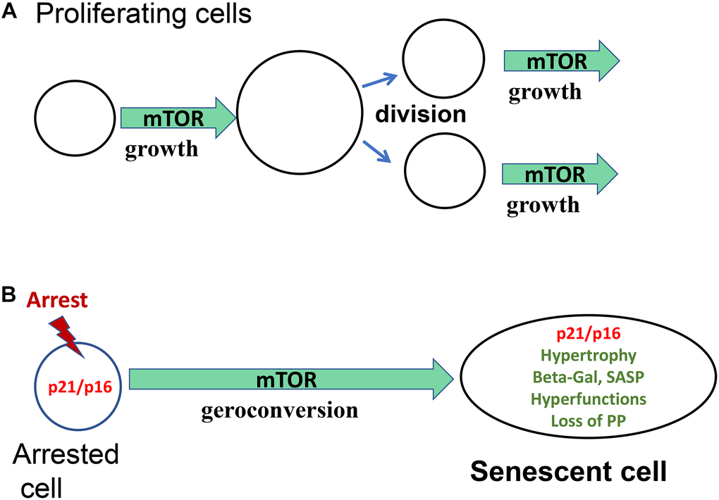 Geroconversion is a continuation of cellular growth, when the cell cycle is blocked [1]. It may also partially occur in proliferating cells and is overstimulated in cell culture conditions. Cellular mass (volume) growth is driven in part by growth-promoting pathways such as mTOR [6]. And this is how the anti-aging activity of rapamycin was predicted, before life-extension was shown in animals [9].