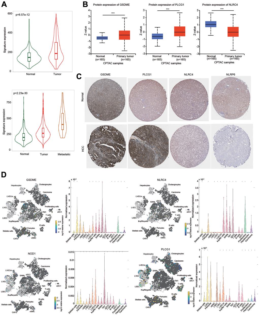 The protein expression level of these genes was examined according to the CPTAC database. The protein levels of GSDME and PLCG1 were higher, while the protein level of NLRC4 was lower in HCC than in normal tissues (Figure 10B). IHC results were obtained from the HPA database to further estimate the protein expression levels of GSDME, NLRC4, PLCG1 and NLRP6. The protein levels of GSDME and PLCG1 were upregulated in HCC, which was consistent with the CPTAC data. In contrast, the protein levels of NLRC4 and NLRP6 were downregulated in HCC compared with normal liver tissues (Figure 10C).