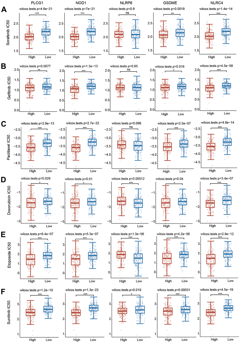 We then evaluated whether the 5 PRGs affected the sensitivity of chemotherapy drugs using the GDSC database (Figure 11). According to the median expression of these 5 PRGs, HCC patients were separated into high-expression and low-expression groups. The IC50 values of all these chemotherapeutic drugs were significantly different between the high-expression group and the low-expression group (Figure 11). These data illustrate that HCC patients with increased expression of 5 PRGs are more sensitive to common chemotherapeutic agents.