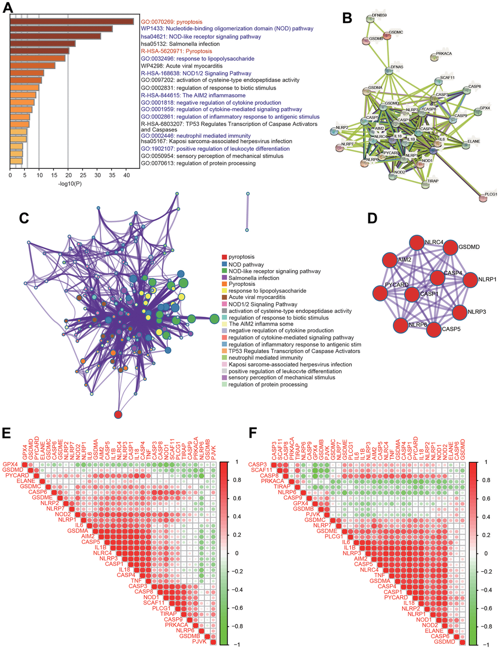 To further investigate the mechanisms of PRGs with differential expression in HCC, signaling pathway analysis was carried out using the Metascape database. Consistent with our speculation, these PRGs were strongly and positively associated with pyroptosis (Figure 2A). Additionally, these PRGs were also remarkably involved in various immunity-related pathways, including the nucleotide-binding oligomerization domain (NOD) pathway, NOD-like receptor signaling pathway, response to lipopolysaccharide, NOD1/2 signaling pathway, AIM2 inflammasome, negative regulation of cytokine production, regulation of cytokine-mediated signaling pathway, regulation of inflammatory response to antigenic stimulus, neutrophil-mediated immunity, and positive regulation of leukocyte differentiation (Figure 2A). Moreover, PPI networks were generated through the Metascape and STRING databases (Figure 2B, 2C). Additionally, the core interactions of PRGs are shown in Figure 2D. We then assessed the correlations among these PRGs. There were positive or negative correlations among the thirty-three PRGs according to the TCGA and ICGC databases (Figure 2E, 2F).