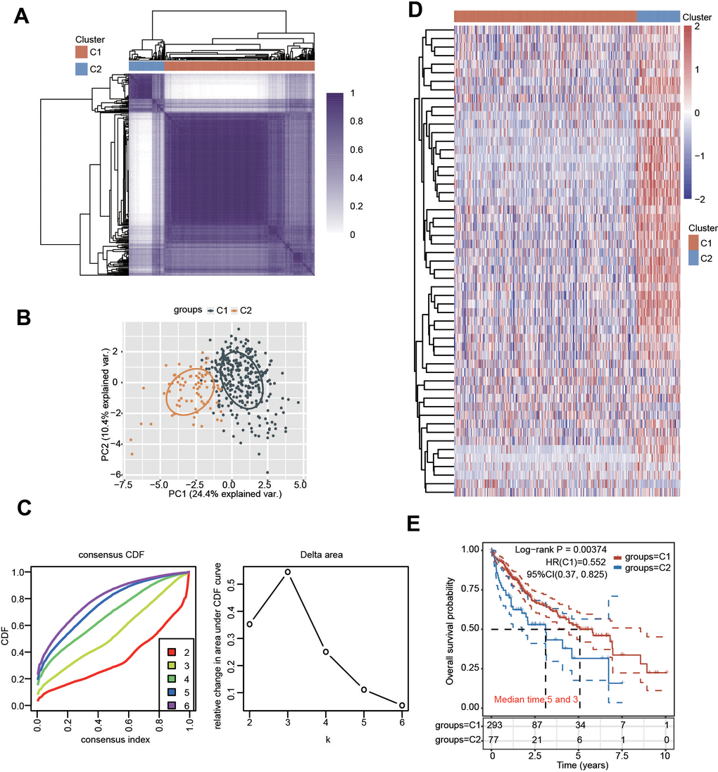 Depending on the diverse expression levels of PRGs, we performed consensus clustering analysis. We identified k = 2 as the variable clustering stability, suitably dividing HCC patients into two subgroups (Figure 3A). Considering the transcriptome data of these 2 clusters, PCA was conducted (Figure 3B, 3C). The expression of these PRGs in the two clusters was further estimated (Figure 3D and Supplementary Figure 3). Most PRGs were highly expressed in cluster 2 (C2) compared with cluster 1 (C1) (Figure 3D and Supplementary Figure 3). Additionally, obvious differences in survival between the two clusters and worse OS were observed in HCC patients in C2 compared with those in C1 (Figure 3E). In addition, there were obvious differences in multiple clinicopathological parameters between the two clusters, including grade, T stage and TNM stage (Table 1).