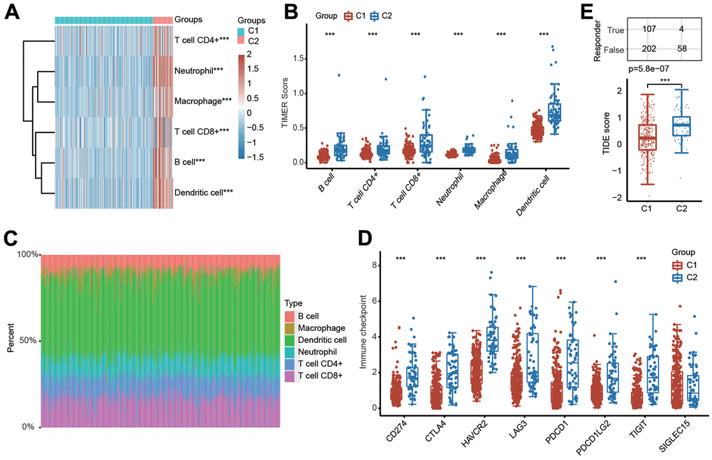 Because PRGs were closely associated with the immune response (Figure 2A), we then explored the relationship between different clusters and the tumor immune microenvironment. The results of the TIMER algorithm illuminated that the infiltration scores of six major immune cells, including CD4+ T cells, B cells, CD8+ T cells, macrophages, neutrophils and dendritic cells, in C1 were obviously lower than those in C2 (Figure 4A, 4B). The percentage abundance of infiltrated immune cells in each HCC patient is shown with different colors and immune cell types (Figure 4C). We also investigated the influence of different clusters on the expression levels of well-known important immune checkpoint genes and observed that the expressions of CD274, PDCD1, PDCD1LG2, CTLA4, LAG3, HAVCR2 and TIGIT were markedly downregulated in C1 compared with C2 (Figure 4D). More importantly, the TIDE score was lower in C1 than in C2, suggesting a better response to immunotherapy in C1 (Figure 4E).