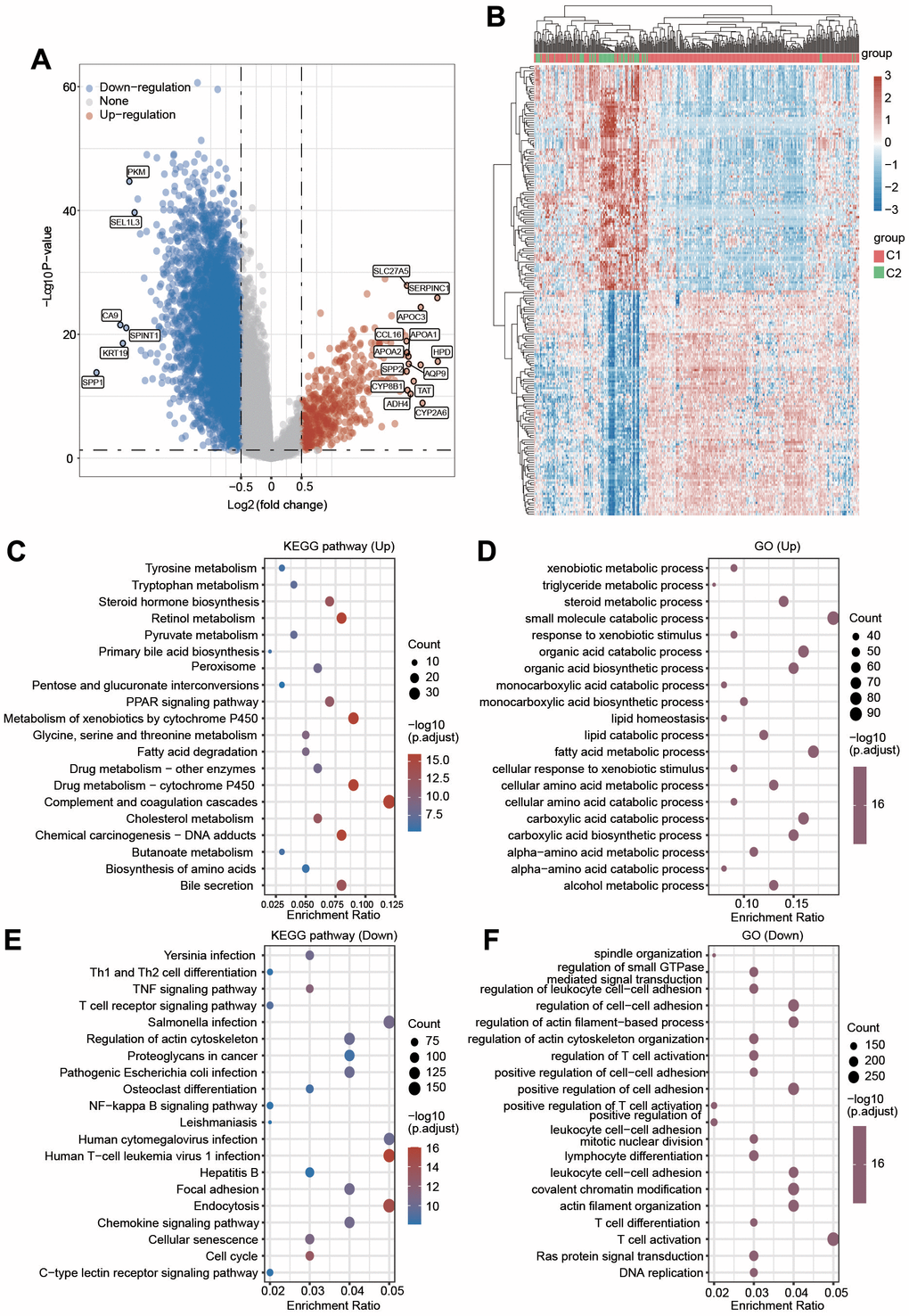 To further elucidate the molecular mechanism underlying the difference between C1 and C2, we then investigated the alteration of gene expression between these two clusters. As shown in Figure 5A, 5B, 486 genes were significantly upregulated and 6643 genes were downregulated in C1 compared with C2. Next, GO and KEGG analyses were performed to explore the different signaling pathways between C1 and C2 using upregulated or downregulated genes. The top 5 enriched KEGG pathways for upregulated genes were complement and coagulation cascades, metabolism of xenobiotics by cytochrome P450, drug metabolism-cytochrome P450, retinol metabolism and bile secretion (Figure 5C). The top 5 enriched pathways for upregulated genes were small molecule catabolic process, fatty acid metabolic process, carboxylic acid catabolic process, organic acid catabolic process and carboxylic acid biosynthetic process (Figure 5D). The top 5 enriched KEGG pathways for downregulated genes were endocytosis, Salmonella infection, human cytomegalovirus infection, human T-cell leukemia virus 1 infection and chemokine signaling pathway (Figure 5E). Additionally, the top 5 enriched GO terms for downregulated gene pathways were T-cell activation, covalent chromatin modification, regulation of cell–cell adhesion, actin filament organization, and positive regulation of cell adhesion (Figure 5F). These data imply that the difference between C1 and C2 is linked with metabolism- and immunity-associated signaling pathways.