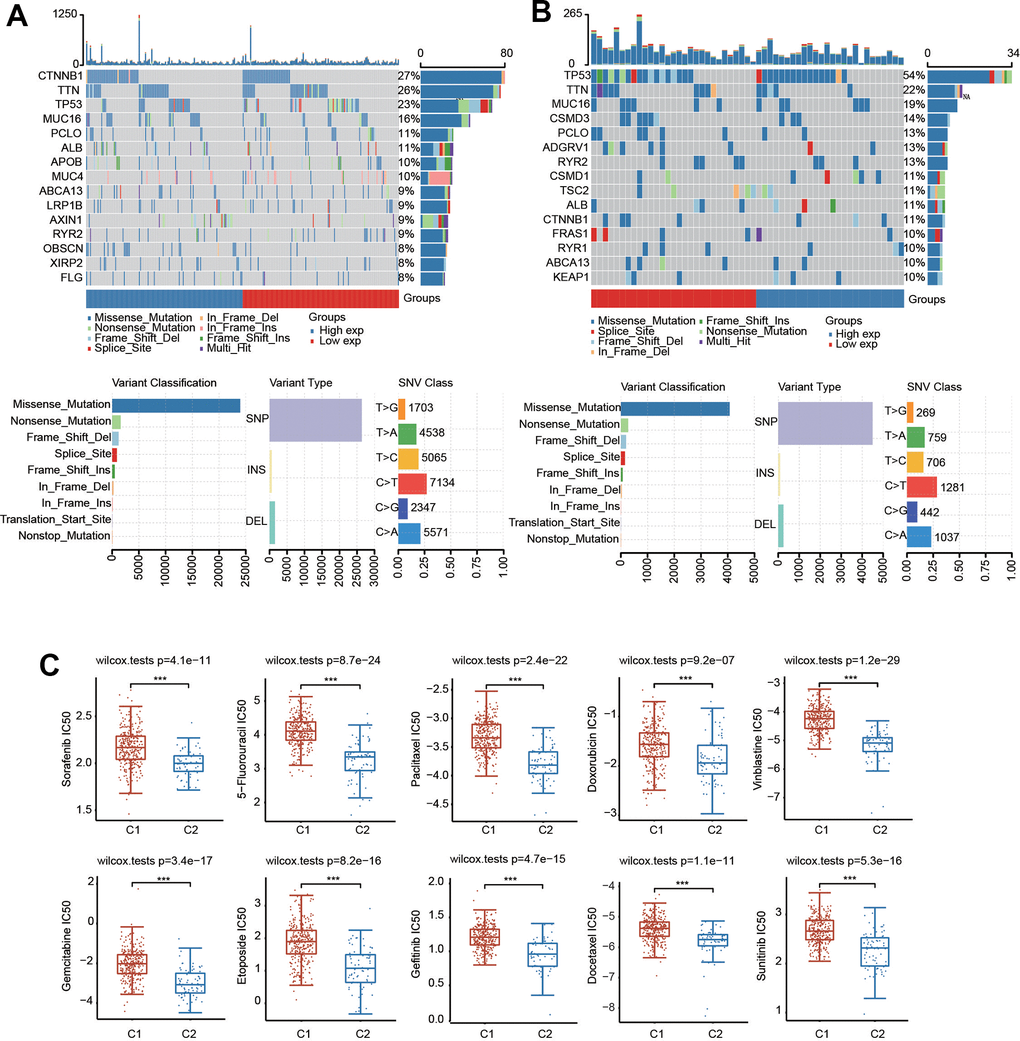 We then generated the mutation profiles of HCC patients in C1 and C2 using the TCGA database. In C1, the top five genes with high mutation rates were CTNNB1, TTN, TP53, MUC16 and PCLO (Figure 6A). In contrast, TP53, TTN, MUC16, CSMD3 and PCLO were the most common mutation cohorts of genes altered in C2 (Figure 6B). In addition, missense was the primary type of mutation, and SNP was the major variant in both C1 and C2 (Figure 6A, 6B). The results of SNV class revealed that the most common type of the two risk groups was C > T (Figure 6A, 6B).