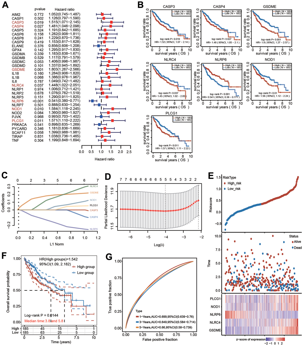 Univariate regression analysis was first applied to select PRGs that were correlated with prognosis in HCC. Then, LASSO (least absolute shrinkage and selection operator) regression analysis with the R package “glmnet” was applied to construct the risk score model after univariate regression analysis. The equation was established as follows: risk score = sum of coefficients × prognostic PRG expression levels. KM curves and receiver operating characteristic (ROC) curves were further utilized to examine the prognostic ability of the risk model.