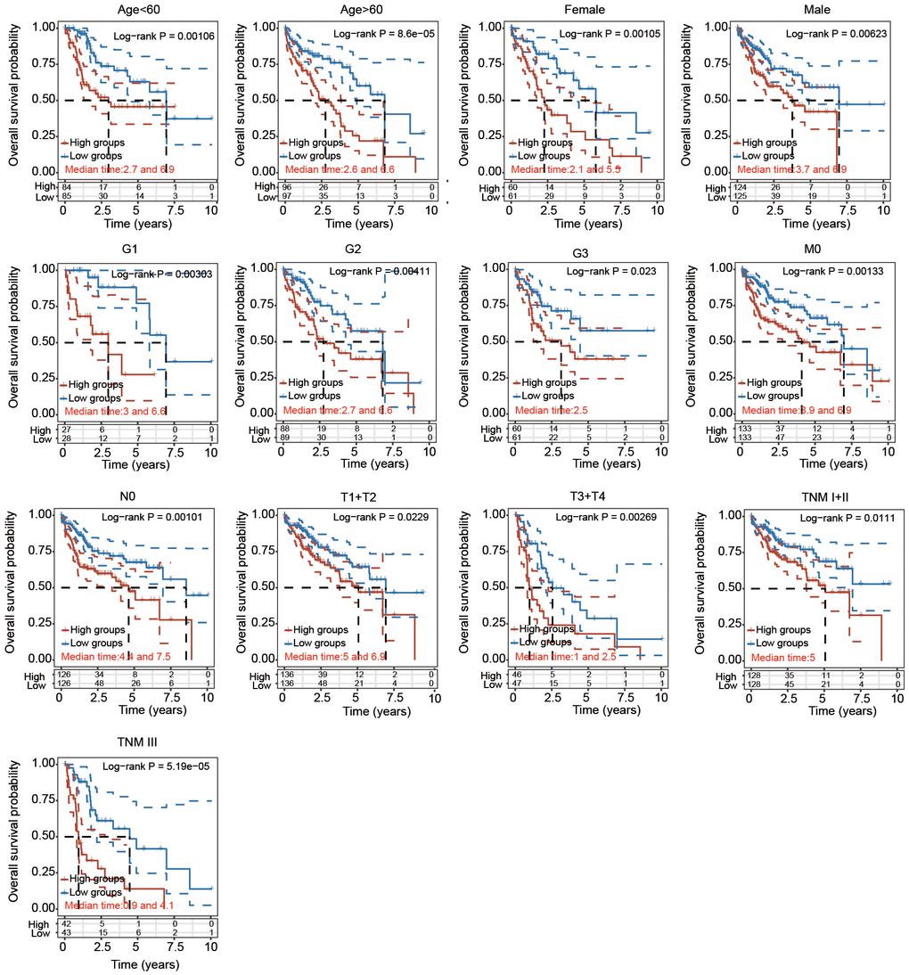 To further certify the prognostic value of the 5-PRG signature, the association between various clinicopathological parameters and risk score was explored. The high-risk score of the 5-PRG signature was obviously associated with worse OS in young (< 60 years), old (> 60 years), female, male, early stage (T1 + T2), advanced stage (T3 + T4), early grade (G1 and G2), advanced grade (G3), M0, N0, TNM stage I+II and TNM stage III HCC patients (Figure 8). Together, these data suggest that the 5-FRG signature can predict OS among each stratum of age, sex, stage and grade and further prove the good stratification ability of the 5-PRG prognostic model.