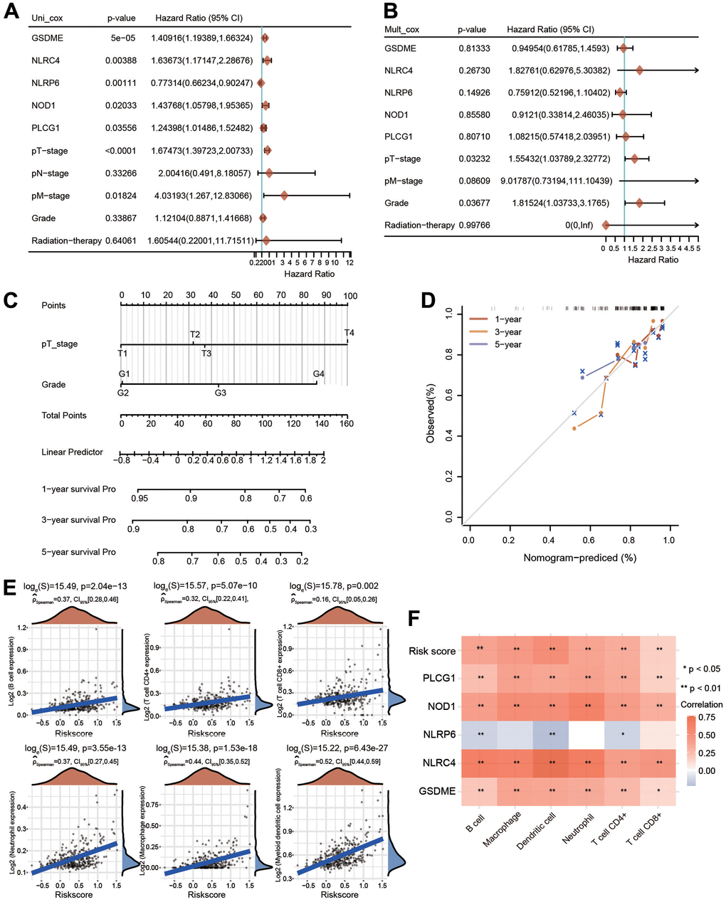 To further assess the prognostic value of the PRG-related prognostic signature in HCC patients, we performed univariate and multivariate Cox regression analyses (Figure 9A, 9B). Following univariate Cox regression analysis, GSDME, NLRC4, NLRP6, NOD1, PLCG1, T stage and M stage were clearly related to OS (Figure 9A). Following the results of multivariate Cox regression analysis, T stage and grade had obvious correlations with OS (Figure 9B). A nomogram model integrating T stage and grade was further constructed to predict the OS of HCC patients based on multivariate regression analysis (Figure 9C). The calibration plots of the nomogram illuminated good agreement between the nomogram-predicted and actual 1-, 3- and 5-year survival rates (Figure 9D).