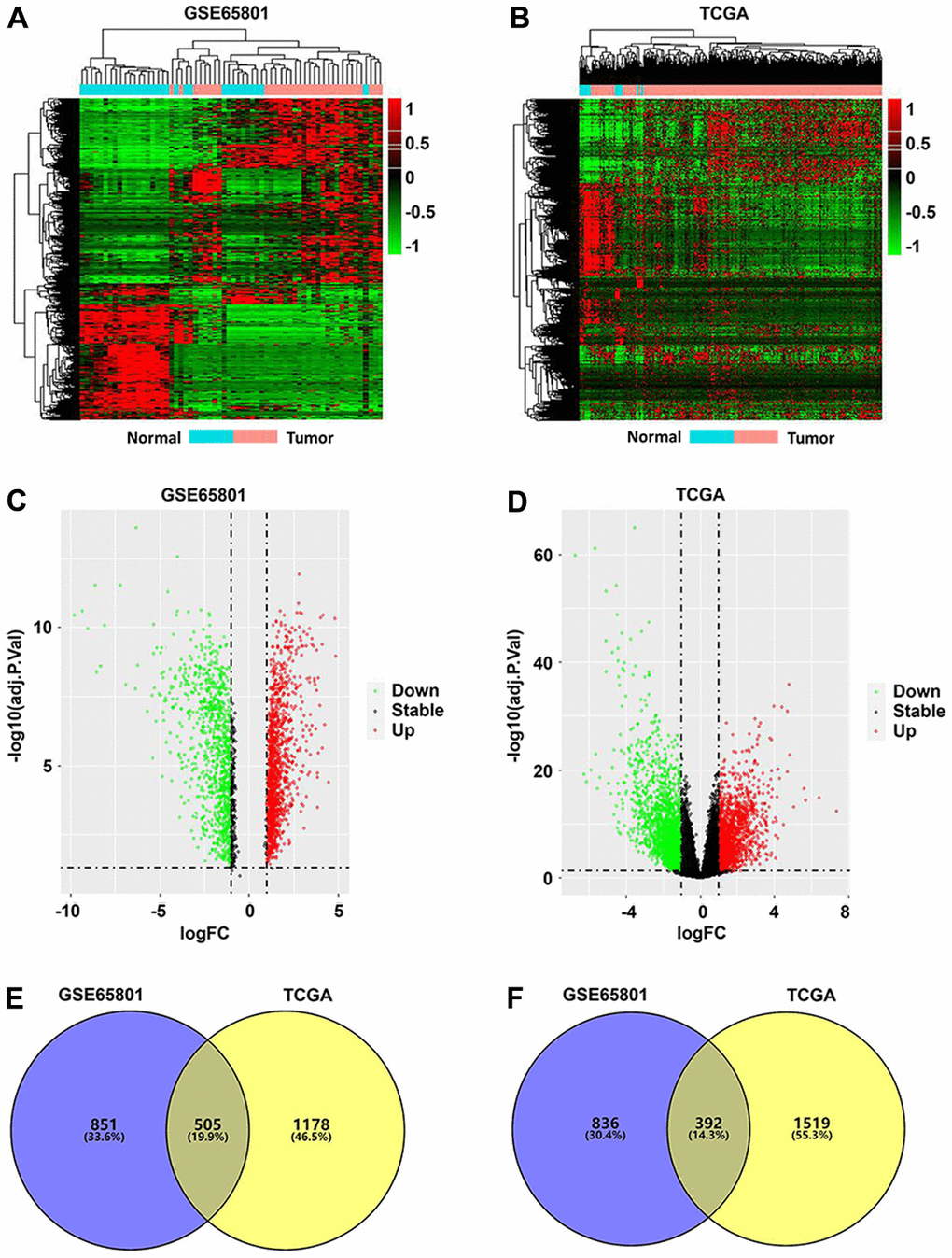 A total of 2,584 DEGs were identified from the GSE65801 dataset, including 1,356 upregulated and 1,228 downregulated DEGs, whereas 3,594 DEGs were screened from the TCGA-STAD dataset, which included 1,683 upregulated and 1,911 downregulated DEGs. The DEGs identified from the two datasets were visualized via heatmaps and volcano plots (Figure 1A–1D). Venn analysis revealed a total of 505 upregulated (Figure 1E) and 392 downregulated intersecting DEGs (Figure 1F) between the GSE65801 and TCGA-STAD datasets.