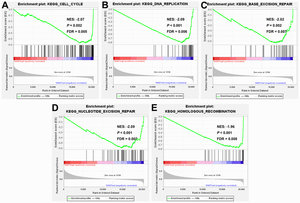 GSEA is a powerful algorithm for predicting potential biological processes or signaling pathways correlated with the specific gene set by comparing the statistical differences of enrichment analysis between the two groups previously defined via the phenotypes of the desired genes [30]. In the current study, the samples from the TCGA-STAD dataset were classified into GNG7 low- and high-expression groups according to the median expression value, and GSEA (version 4.2.3) software (http://software.broadinstitute.org/gsea/index.jsp) was then used to speculate the signaling pathways associated with GNG7 expression in GC. c2.cp.kegg.v7.5.1. symbols.gmt, downloaded from the Molecular Signature Database (http://www.gseamsigdb.org/gsea/msigdb/), was used as the reference gene set, and |normalized enrichment score | > 1, nominal P < 0.05 and FDR < 0.25 were used as the cutoff criteria.