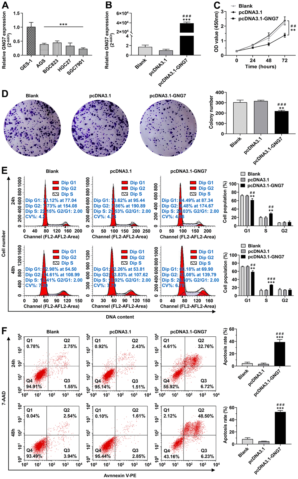 According to bioinformatic analysis, GNG7 was significantly downregulated in GC. This finding was further validated via qRT-PCR. The results from the UALCAN database revealed that the expression of GNG7 was correlated with the race, age, histological subtypes, tumor grade, individual cancer stages, and TP53 mutation status of patients with GC. Of note, the enrichment analysis of GNG7-coexpressed genes and gene sets using data derived from the TCGA-STAD cohort attested that GNG7 was exceedingly implicated in the proliferation and cell cycle processes of GC cells. Many researchers have evaluated the effect of GNG7 in other cancer types. Liu et al. found that GNG7 overexpression shortened the G0/G1 phase and delayed the G2/M phase of cervical cancer cells [56]. Xu et al. showed that the knockdown of GNG7 promoted cell proliferation by shortening the G0/G1 phase and delaying the G2/M phase of cell cycle in clear cell renal cell carcinoma [78]. Shibata et al. revealed that GNG7 inhibited esophageal cancer cell growth by arresting the cell cycle at the G0/G1 phase [79]. Moreover, Mei et al. confirmed that GNG7 overexpression inhibited cell proliferation and induced apoptosis in breast cancer cells, whereas GNG7 knockdown showed reverse effects [75]. Consistent with these findings, the present study results revealed that compared with control cells, the proliferation and colony-formation abilities were decreased and the apoptotic levels were increased in GNG7-overexpressing SGC7901 cells. Furthermore, GNG7 overexpression shortened the G1 phase and delayed the S phase of SGC7901 cells without affecting the G2 phase, suggesting that GNG7 blocks cell cycle progression by inhibiting the progression of stage S to stage G2. Considering these findings, it could be concluded that GNG7 suppresses GC cell growth by arresting the cell cycle at the S phase and promoting cancer cell apoptosis.