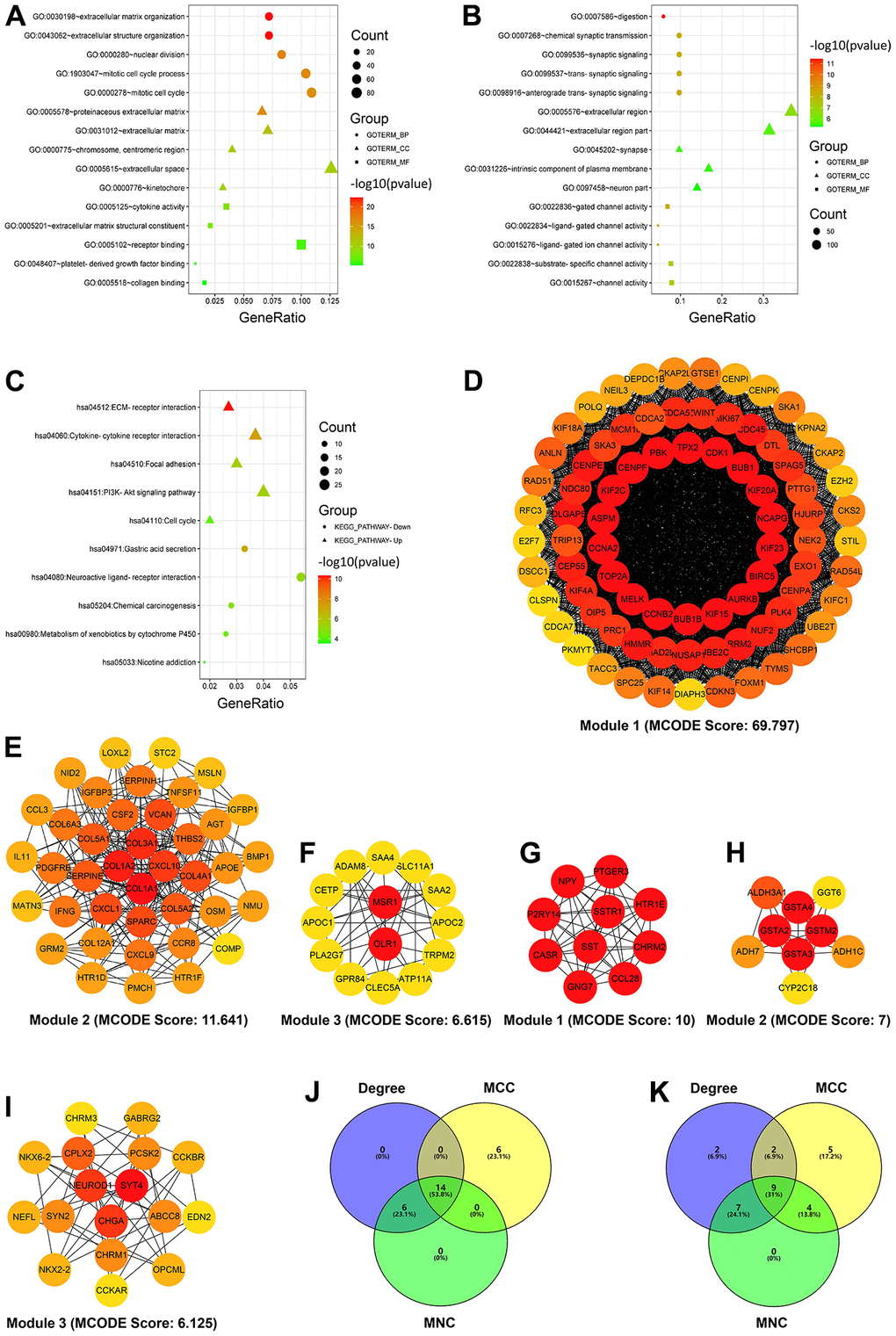 For a better understanding of the up and downregulated intersecting DEGs, the two gene lists were mapped into the DAVID database for GO and KEGG pathway enrichment analyses. The GO enrichment analysis of the biological process revealed that the upregulated DEGs were associated with extracellular matrix organization, extracellular structure organization, nuclear division, mitotic cell cycle process, and mitotic cell cycle, whereas the downregulated DEGs were involved in the processes of digestion, chemical synaptic transmission, synaptic signaling, trans-synaptic signaling, and anterograde trans-synaptic signaling. Cellular component enrichment analysis revealed that the upregulated DEGs were predominantly enriched in proteinaceous extracellular matrix, extracellular matrix, chromosome centromeric region, extracellular space, and kinetochore, whereas the downregulated DEGs were enriched in the extracellular region, extracellular region part, synapse, intrinsic component of the plasma membrane, and neuron part. Regarding the molecular function, the upregulated DEGs were principally associated with cytokine activity, extracellular matrix structural constituent, receptor binding, platelet-derived growth factor binding, and collagen binding, whereas the downregulated DEGs were correlated with gated channel activity, ligand-gated channel activity, ligand-gated ion channel activity, substrate-specific channel activity, and channel activity (Figure 2 and Table 2).