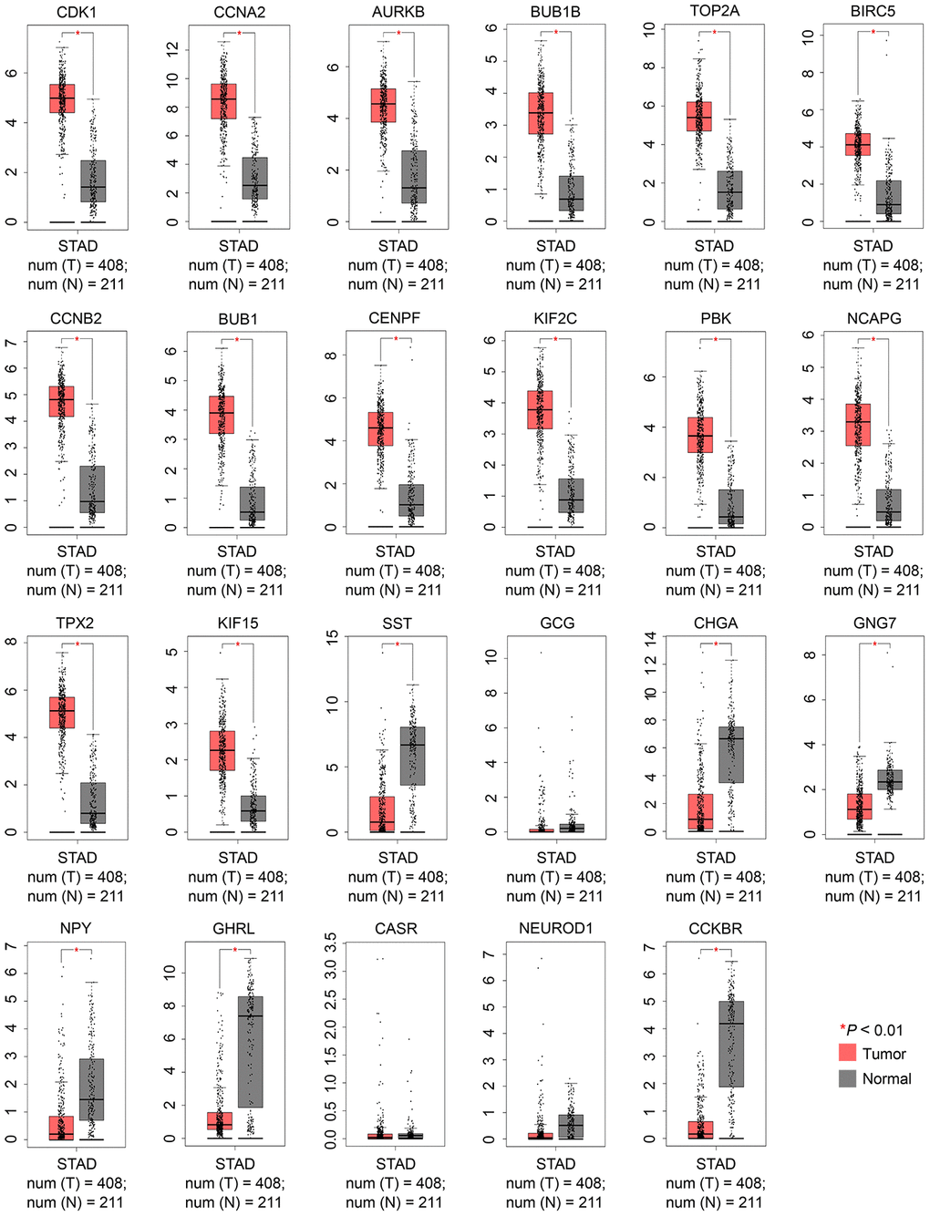 GEPIA (http://gepia.cancer-pku.cn/) is a convenient online tool that is widely utilized in several customizable analyses, including differential expression analysis, correlation analysis, prognosis analysis, and others, based on the RNA-seq expression data of 9,736 tumor and 8,587 normal samples from TCGA and Genotype-Tissue Expression programs [20]. In the present study, GEPIA (version 2) was used to analyze expression differences in the candidate hub genes between GC and normal control samples.