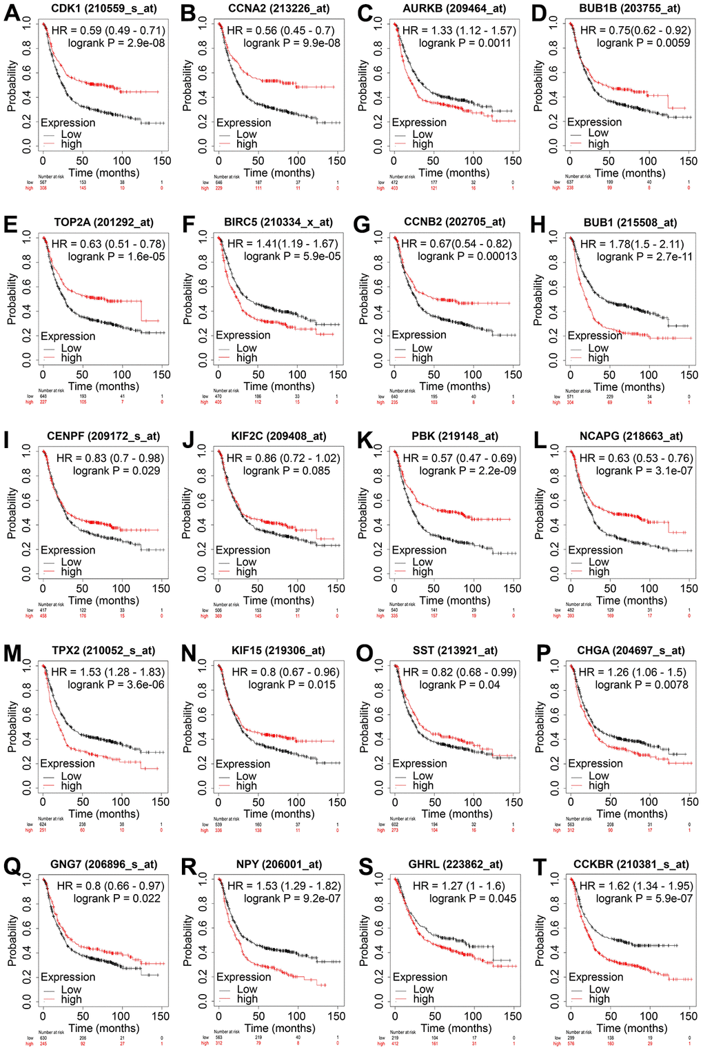 The Kaplan–Meier plotter is a web portal designed for performing survival analysis based on the gene expression and prognostic data of 21 cancer types derived from GEO, European Genome-phenome Archive, and TCGA databases [21]. In the present study, the prognostic values of the hub genes for the overall survival of patients with GC were estimated using the Kaplan–Meier plotter via the log-rank test. Besides, the median value of transcripts per million was adopted as the cutoff to dichotomize patients with GC into low- and high-expression groups, and log-rank P < 0.05 was considered statistically significant.