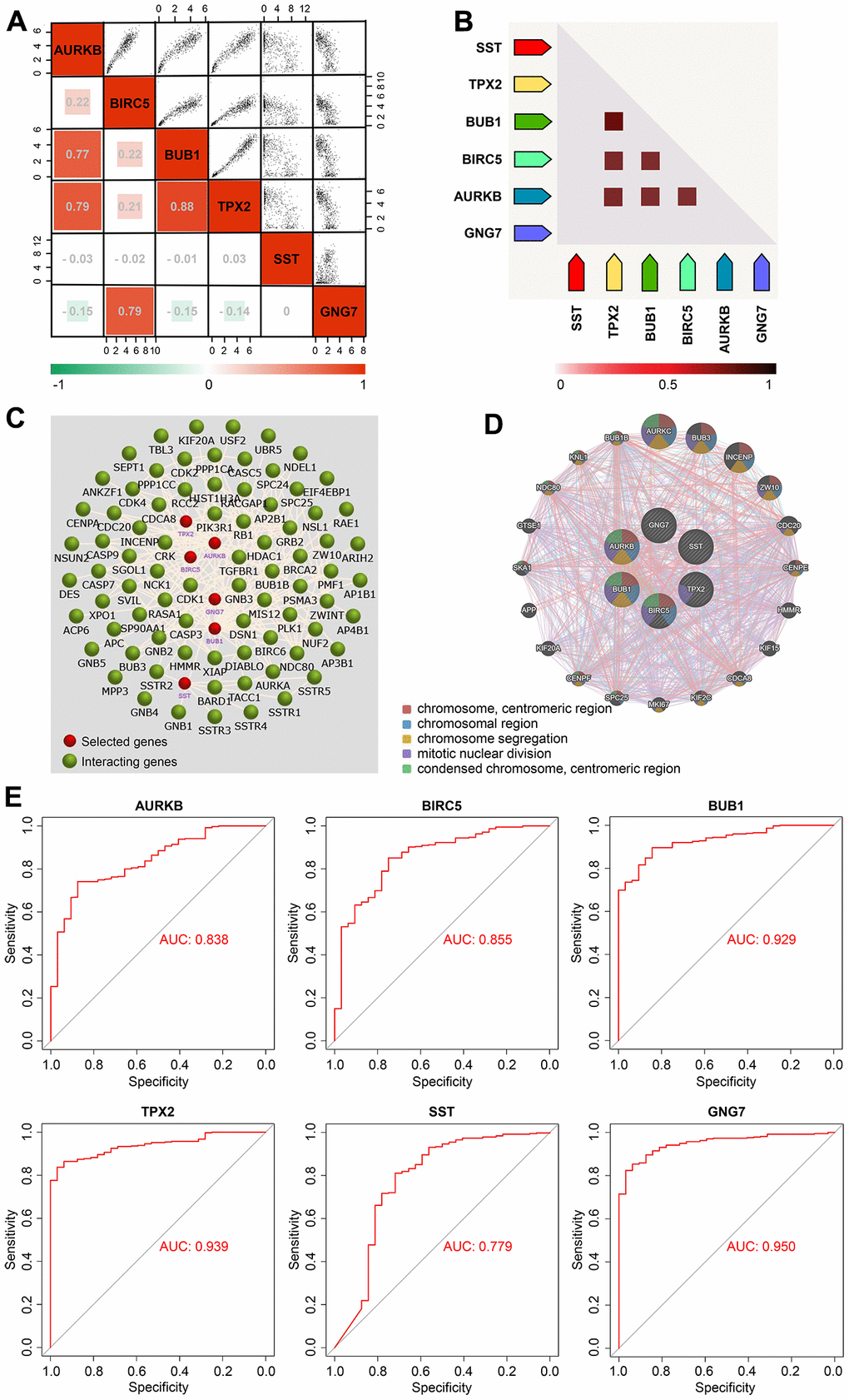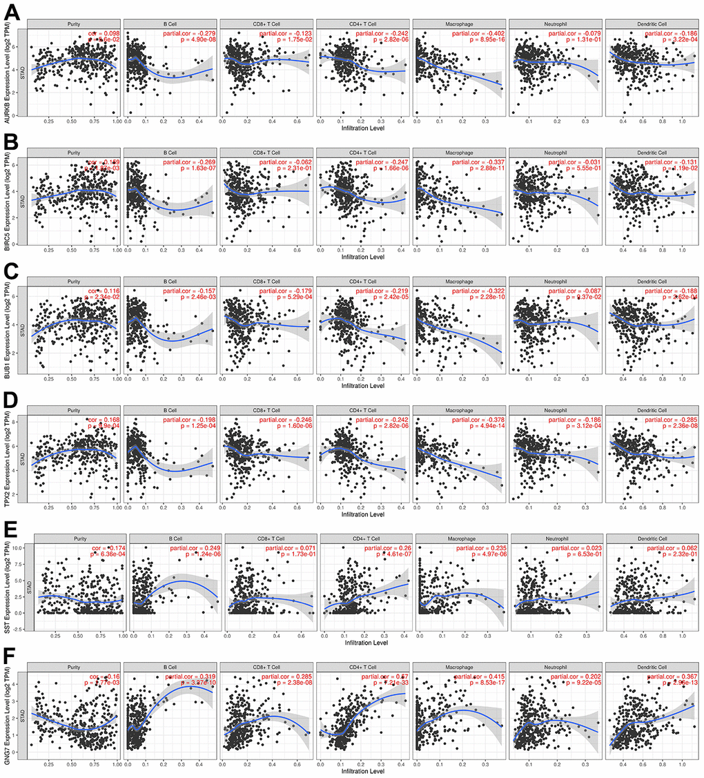 Through in-depth analysis using three methods in the CytoHubba plug-in of Cytoscape, a total of 23 DEGs were identified as candidate hub genes, of which 20 (CDK1, CCNA2, AURKB, BUB1B, TOP2A, BIRC5, CCNB2, BUB1, CENPF, KIF2C, PBK, NCAPG, TPX2, KIF15, SST, CHGA, GNG7, NPY, GHRL, and CCKBR) were selected as hub genes for their expression patterns in GEPIA2, which is in accordance with our previous analysis of the identified DEGs and candidate hub genes. Because the associations between the expression levels of six hub genes (AURKB, BIRC5, BUB1, TPX2, GNG7, and SST) and overall survival of patients with GC were consistent with our speculation, they were chosen as prognostic signature genes. The involvement of the signature genes in the process of immune infiltration in GC was also confirmed. The correlation and coexpression analyses revealed that these signature genes were correlated and that they interacted with each other. Furthermore, all signature genes had good diagnostic efficiency in distinguishing GC specimens from normal specimens; among the genes, GNG7 displayed the highest diagnostic capability.