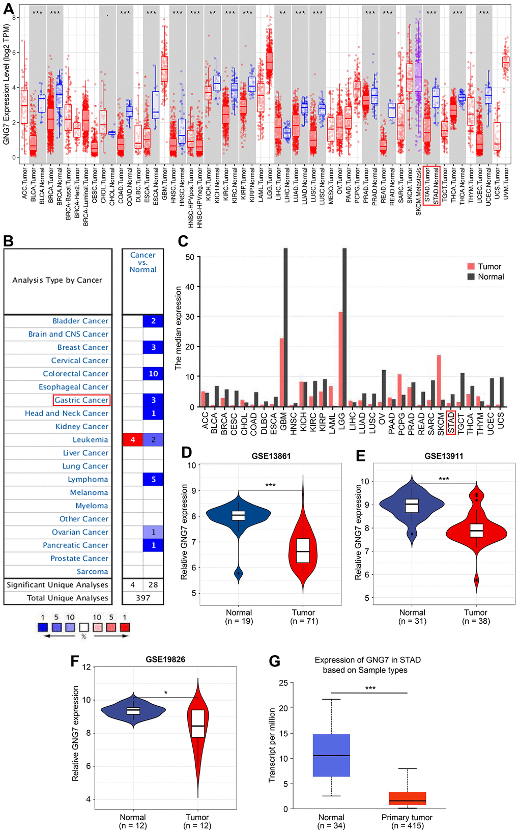 Through high-throughput sequencing and gene microarray technologies, bioinformatic analysis has recently been increasingly used to search for molecular markers or targets involved in tumor development and progression [7–10]. In the present study, the Gene Expression Omnibus (GEO, http://www.ncbi.nlm.nih.gov/geo) and The Cancer Genome Atlas Stomach Adenocarcinoma (TCGA-STAD, https://portal.gdc.cancer.gov/) databases were used to screen the common differentially expressed genes (DEGs) between GC tissues and normal controls. In addition, after protein–protein interaction (PPI) network and module analyses, the online portal Kaplan–Meier plotter (http://www.kmplot.com/analysis/index.php?p=background) and Tumor Immune Estimation Resource (TIMER, https://cistrome.shinyapps.io/timer/) were utilized to access the prognostic value of the identified hub genes. Finally, the seldom reported G protein γ subunit 7 (GNG7) was selected to explore its expression patterns and potential roles in GC via several public databases and functional experiments in vitro. Via a comprehensive analysis, the prognostic implication and therapeutic potential of GNG7 in the progression of GC were discovered. This information may provide novel insights for future studies.