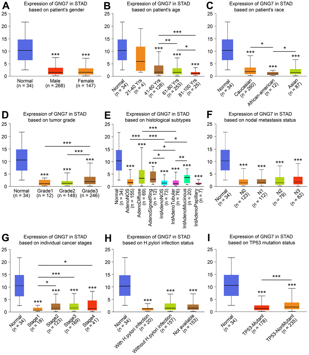 Among the signature genes, the rarely reported GNG7 was selected to explore its potential roles in GC progression. TIMER was primarily utilized to examine the expression patterns of GNG7 in 32 cancer types from the TCGA database. As an online datamining platform, Oncomine (http://www.oncomine.org) integrates data from 715 datasets with >80,000 samples for genome-wide bioinformatic analysis [25]. In the present study, Oncomine was used to detect the expression levels of GNG7 in diverse cancers with P value < 1E-4 and |log2FC| > 2 as the threshold. The GEPIA2 database was further used to identify the expression levels of GNG7 in multiple cancers. Hiplot (https://hiplot.org), an interactive web service, helps users analyze and visualize biomedical data [26]. Using the Violin-Chart tool in Hiplot, the differential expression of GNG7 in GC and normal controls was detected and validated in the GSE13861 (71 GC and 19 normal tissues), GSE13911 (38 GC and 31 normal tissues), and GSE19826 (12 GC and 12 normal tissues) datasets, which were downloaded from the GEO database. UALCAN (http://ualcan.path.uab.edu/index.html) is an open-access web-portal that helps perform the in-depth analysis of cancer-associated omics data from the TCGA, MET500, and CPTAC databases [27]. In the current study, the “TCGA analysis” module of UALCAN was used to explore the expression of GNG7 and its association with the clinicopathological features (sex, age, race, tumor grade, histological subtype, nodal metastasis status, tumor stage, and others) of patients with GC.
