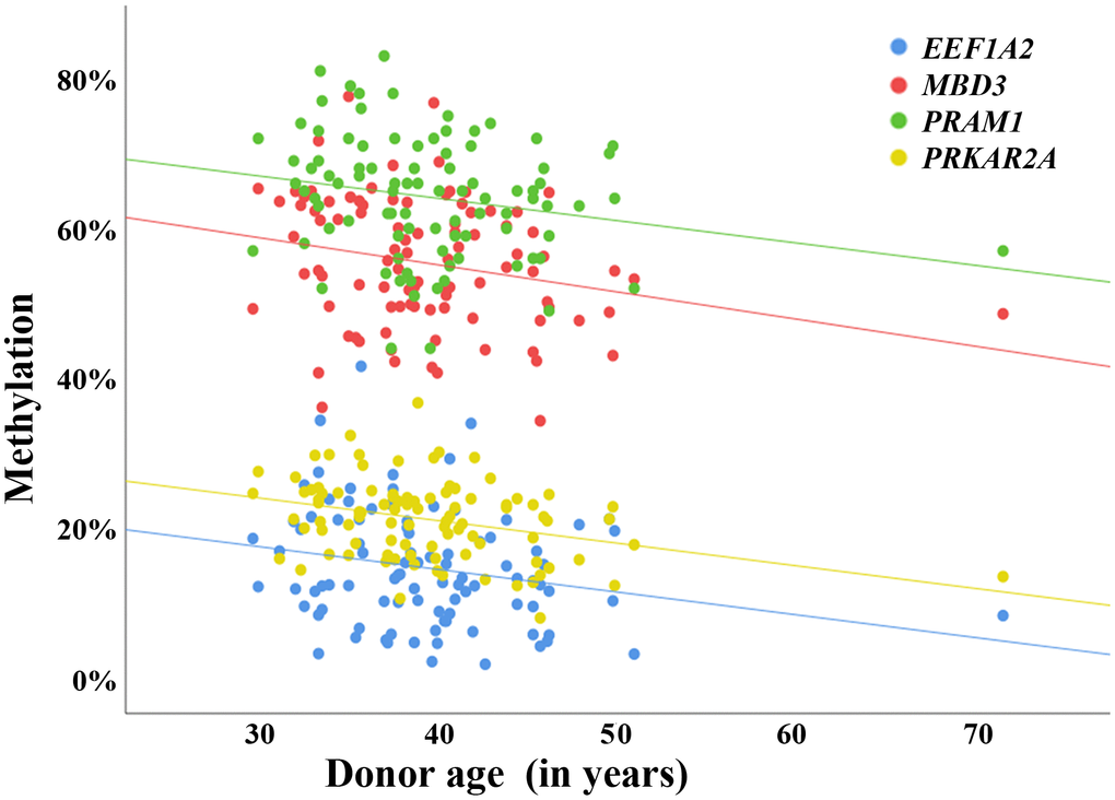 Polymerase chain reaction (PCR) and sequencing primers (Supplementary Table 6) were designed using the PyroMark Assay Design 2.0 software (Qiagen). DNA methylation standards of 0%, 50%, and 100% methylation were used for assay establishment. PCR for each sample was performed in 25 μl reaction consisting of 2.5 μl 10x PCR buffer with MgCl2, 0.5 μl (10 mM) dNTPs, 1.25 μl (10 pmol/ml) of each reverse and forward primer, 0.2 μl (5 U/μl) FastStart Taq DNA polymerase (Roche Diagnostics, Mannheim, Germany), 1 μl (~25 ng) bisulfite converted DNA, and 18.3 μl dH2O. PCR amplifications were carried out with an initial denaturation at 95° C for 5 min, 35 cycles of 95° C for 30 s, primer-specific annealing temperature (Supplementary Table 6) for 30 s, and 72° C for 45 s, and a final extension step at 72° C for 10 min. Pyrosequencing was carried out using Pyro Q-CpG software and PyroMark Gold Q96 CDT reagent kit (Qiagen) on the PyroMark Q96 MD system. Unmethylated and fully methylated DNA standards (Qiagen) were used as controls in each pyrosequencing run. In our experience, the average methylation variation between the technical replicates (including bisulfite conversion, PCR, and pyrosequencing) is approximately 1-2 percentage points. Pearson’s correlations were applied to correlate the donor age with the mean DNA methylation level of four selected amplicons, corresponding to the ageDMRs in PRAM1, EEF1A2, PRKAR2A, and MBD3. An adjusted P value of < 0.05 was considered as statistically significant throughout the analyses.