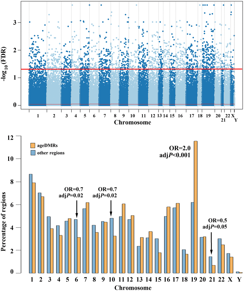 The Manhattan plot in Figure 3 (upper diagram) shows the chromosomal distribution of the 360,264 regions, analysed by RRBS. The 1,565 (0.4%) identified sperm ageDMRs are located above the red threshold, indicating genome-wide significant correlation between sperm methylation and donor age. To find out whether or not ageDMRs are randomly distributed throughout the genome, we compared the percentage of ageDMRs on a specific chromosome (Figure 3, bottom, orange bars) to the percentage of other non-significant regions on the same chromosome (blue bars). The percentages of ageDMRs on all chromosomes and the percentages of other regions, respectively, sum up to 100% each. It is striking that chromosome 19 is highly significantly (adjusted P < 0.001; OR 2.0) enriched with ageDMRs. It contains 181 (11.6%) of 1,565 ageDMRs, compared to 22,309 (6.2%) of 358,699 non-significant regions. In contrast, ageDMRs are significantly underrepresented on chromosomes 6 (3.1% of all ageDMRs vs. 4.7% of all other regions; adj. P = 0.02; OR 0.7), 10 (3.3% vs. 4.8%; adj. P = 0.02; OR 0.7), and borderline significant on chromosome 21 (0.7% vs. 1.5%; adj. P = 0.05; OR 0.5) (Figure 3, bottom diagram). Interestingly, almost half (245 of 509; 48%) of the zincfinger (ZF) genes that are covered in our RRBS data set are located on chromosome 19. Altogether we identified 14 ageDMRs in 11 ZF genes on chromosome 19, and 14 ageDMRs in 11 ZF genes on other chromosomes. Thus, the ZF genes on chromosome 19 are not enriched with ageDMRs.