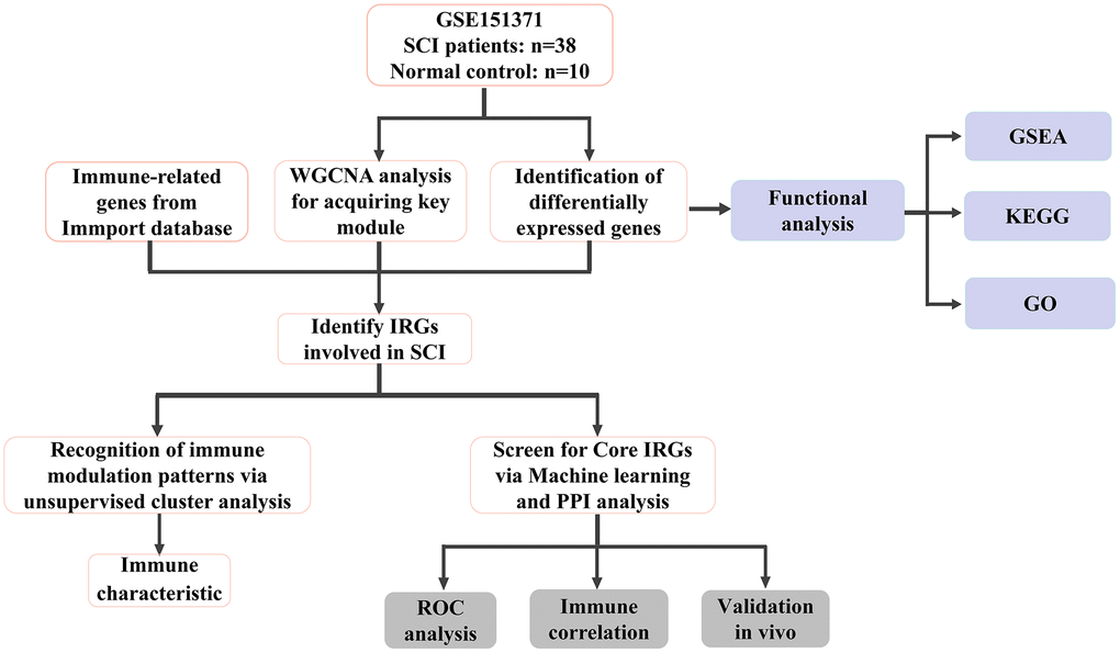 Recently, bioinformatics analysis combined with machine learning has been widely applied to genomic biodata to detect reliable and robust biomarkers for the diagnosis and treatment of diseases [17, 18]. In this study, we utilized bioinformatics analysis to synthesize the role of IRGs based on peripheral blood transcriptomic data from SCI patients. Subsequently, machine learning was performed to identify 2 immune modulation patterns for SCI patients and screen robust biomarkers to diagnose SCI patients. Finally, we validated these biomarkers with in vivo experiments. Our findings provided a solid theoretical foundation for further characterizing the role of immune response in SCI.