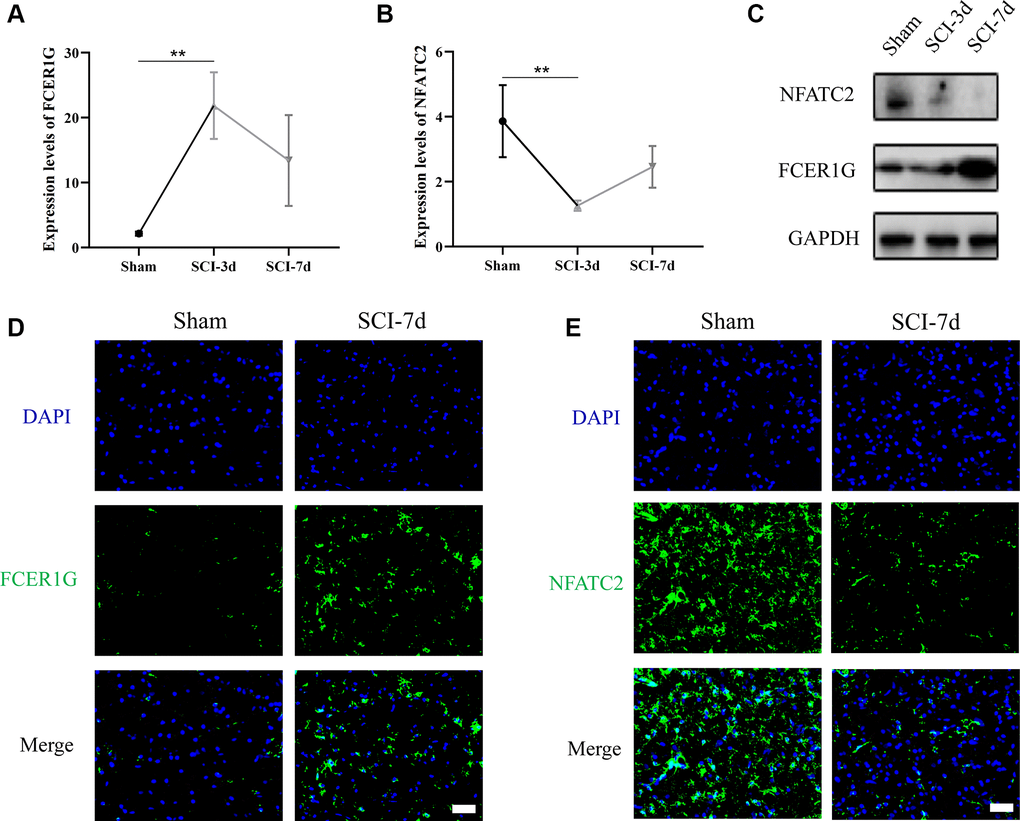 Transcriptomic data from rat spinal cord tissues revealed that FCER1G expression was significantly higher in the SCI-d3 than in the sham group, while NFATC2 exhibited the opposite result (Figure 10A, 10B). Western blot (WB) analysis also demonstrated comparable trends (Figure 10C). Immunofluorescence (IF) analysis revealed that FCER1G protein expression in SCI-d7 was significantly above the sham group, while NFATC2 protein expression in SCI-d7 was visibly lower than that in the sham group (Figure 10D, 10E).