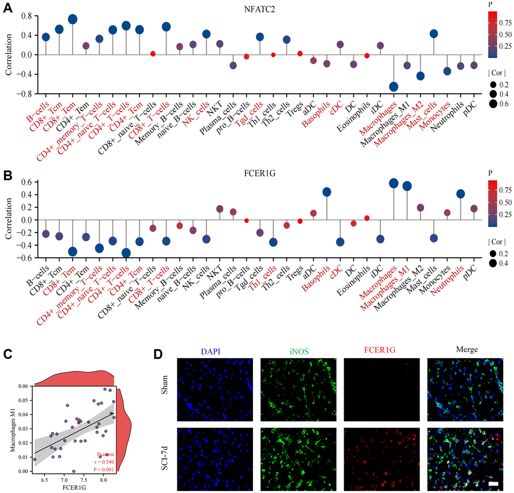 We found that Core IRGs were intimately associated with multiple immune cells. NFATC2 was mainly positively correlated with a range of lymphoid cells and negatively correlated with myeloid cells (Figure 11A). In contrast, FCER1G was mostly positively correlated with a variety of myeloid cells, and negatively correlated with lymphoid cells (Figure 11B). Notably, FCER1G was positively linked to macrophage M1, which has been suggested to be essential immune cells in the development of pro-inflammatory effects of SCI (Figure 11C). Subsequently, IF analysis identified that FCER1G expression was colocalized with iNOS positive macrophage, which validated the relationship between FCER1G and macrophage M1(Figure 11D).