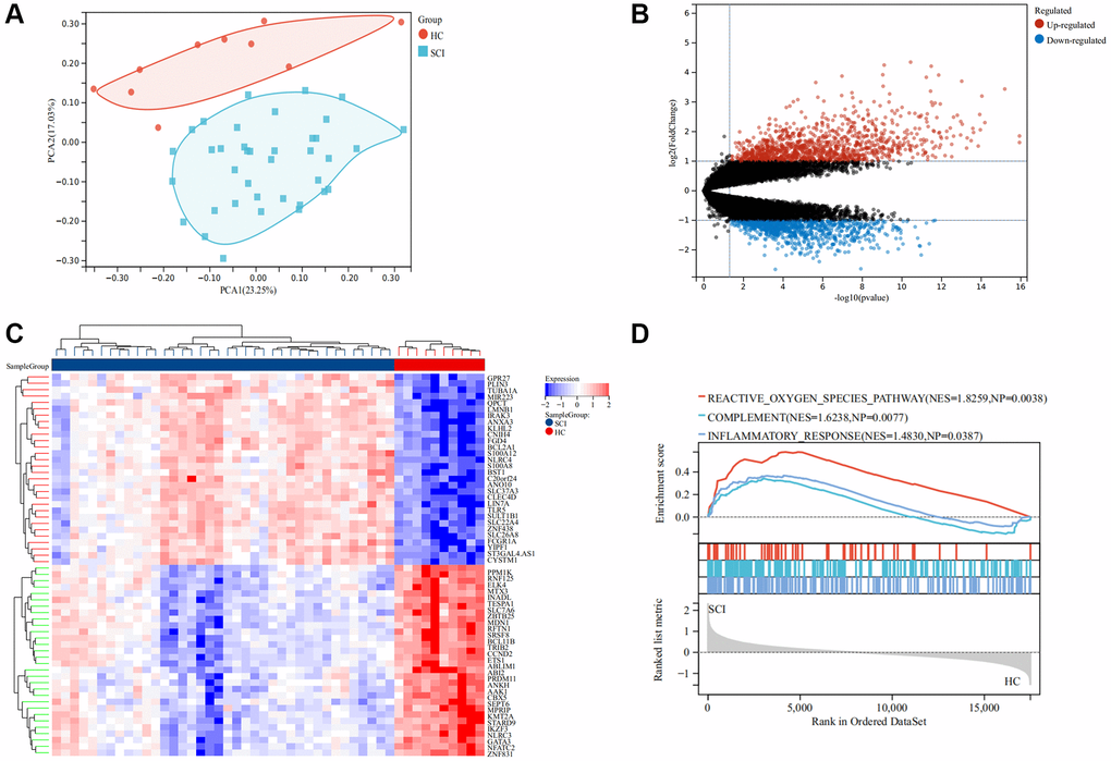 PCA was used to discriminate the characteristics between SCI and HC groups. Then, the R “limma” package was adopted to filter DEGs, with |log2Fold |≥1 and p-value ≤ 0.05 set as the threshold.