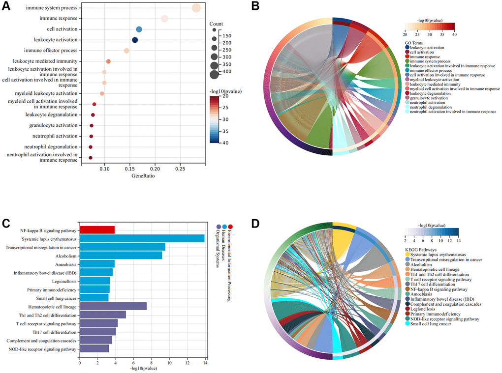 The flow chart of this study was shown in Figure 1. As illustrated in Figure 2A, the SCI and HC groups could be distinguished. Subsequently, a total of 2067 differentially expressed genes (DEGs) were identified between SCI and healthy controls (HC), of which 1160 were up-regulated genes and 907 were down-regulated genes (Figure 2B). Heat map showing the expression of the top 30 DEGs between SCI and HC groups (Figure 2C). Moreover, Gene set enrichment analysis (GSEA) revealed marked activation of inflammatory responses, complement, and reactive oxygen species (ROS) in the SCI compared to the HC group (Figure 2D). Gene Ontology (GO) analysis indicated that these DEGs were concerned with the immune system process, immune response, cell activation, and so on (Figure 3A, 3B). Kyoto Encyclopedia of Genes and Genomes (KEGG) analysis identified that these DEGs were mainly involved in hematopoietic cell lineage, Th1 and Th2 cell differentiation, T cell receptor signaling pathways, etc., (Figure 3C, 3D).
