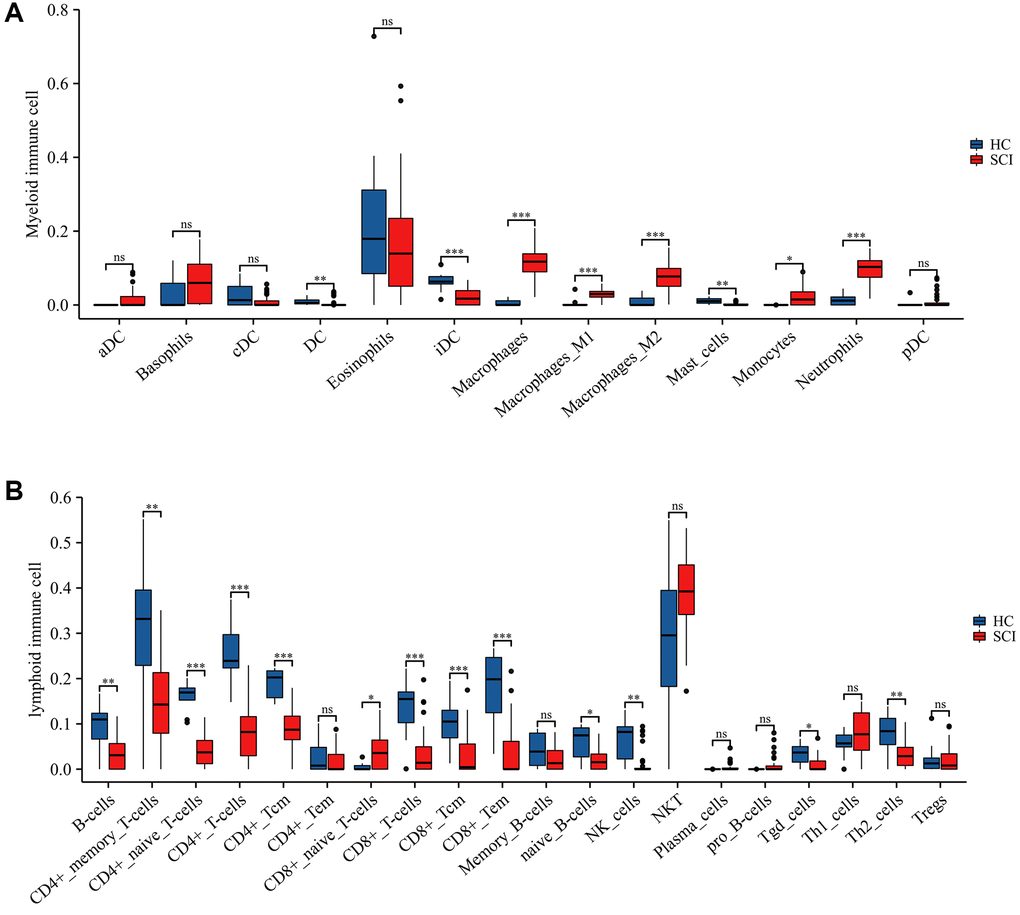 To evaluate the differences in immune infiltrating cells between SCI and HC groups, gene expression profiles were uploaded into xCELL (https://xcell.ucsf.edu/) to obtain the abundance of myeloid and lymphoid cells in peripheral blood [39]. In addition, the ssGSEA algorithm was performed to assess the immune function of each sample.