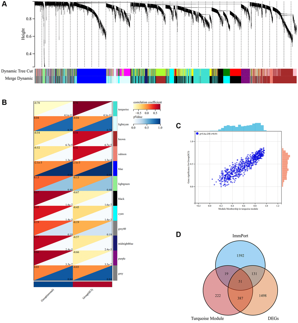 Weighted gene co-expression network analysis (WGCNA) was constructed to screen the most relevant module for the onset of SCI. As shown in Figure 5A, a total of 12 modules were identified by hierarchical clustering and dynamic tree-cutting algorithms. Among the 12 modules, we observed that the turquoise module presented the most positive correlation with SCI (Figure 5B). The turquoise module includes a total of 679 genes which may be critical for the pathological progression of SCI (Figure 5C). Finally, a total of 51 major IRGs were identified based on the intersection of DEGs, turquoise modules, and IRGs (Figure 5D).