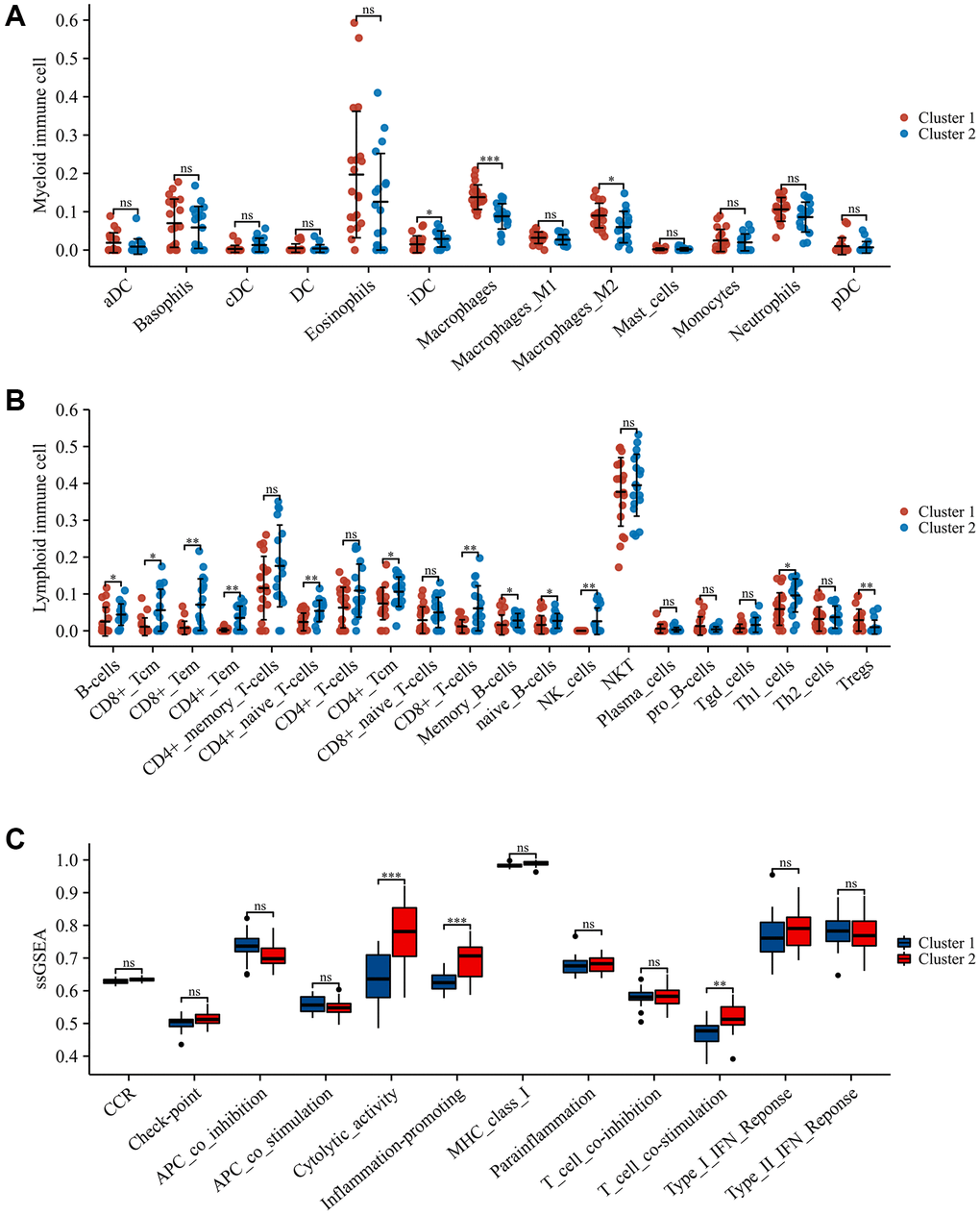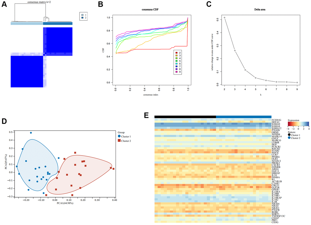 To ascertain the immune subtypes in SCI, unsupervised clustering analysis was applied to precisely classify SCI patients based on the expression profiles of 51 IRGs. Eventually, k = 2 was identified as the best number of patterns (Figure 6A–6C). Principal component analysis (PCA) revealed that these two patterns could be distinguished (Figure 6D). The heat map demonstrated the expression of these 51 IRGs in different immune modulation patterns (Figure 6E). xCELL analysis revealed an increased abundance of macrophages, macrophage M2, and Treg infiltration in Cluster1 compared to Cluster 2, while CD4+ T cells, CD8+ T cells, NK cells, etc., showed the opposite results (Figure 7A, 7B). Immune function analysis reveals that inflammation-promoting, T-cell co-stimulation, and cytolytic activity were more pronounced in Cluster 2 (Figure 7C). These results indicated that SCI patients can be divided into immunoreactive and immunosuppressive patterns according to immune status.