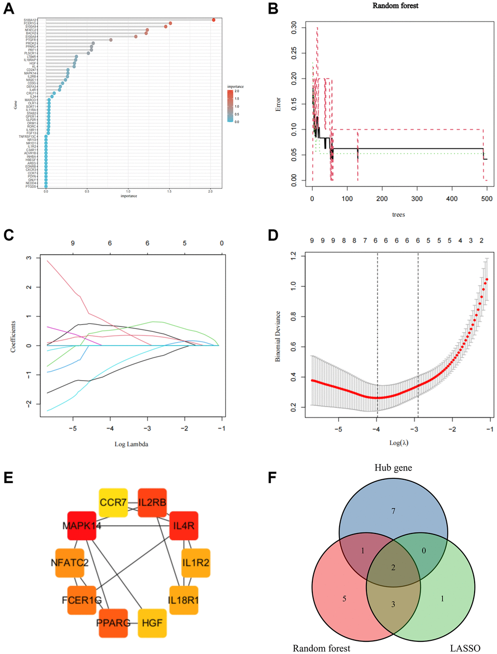 To identify stable and reliable biomarkers to diagnose SCI, two machine learning and PPI analyses were used to further screen 51 IRGs. The Random Forest algorithm identified 11 candidate genes with a relative importance score >0.5 (Figure 8A, 8B). The least absolute shrinkage and selection operator (LASSO) algorithm confirmed 6 candidate genes with the minimum lambda value (Figure 8C, 8D). Moreover, the Protein-Protein interaction (PPI) network identified 10 key genes involved in the occurrence of SCI (Figure 8E). Finally, 2 Core IRGs were identified based on the intersection of the results of the above 3 algorithms which were considered key targets for the diagnosis and treatment of SCI (Figure 8F).