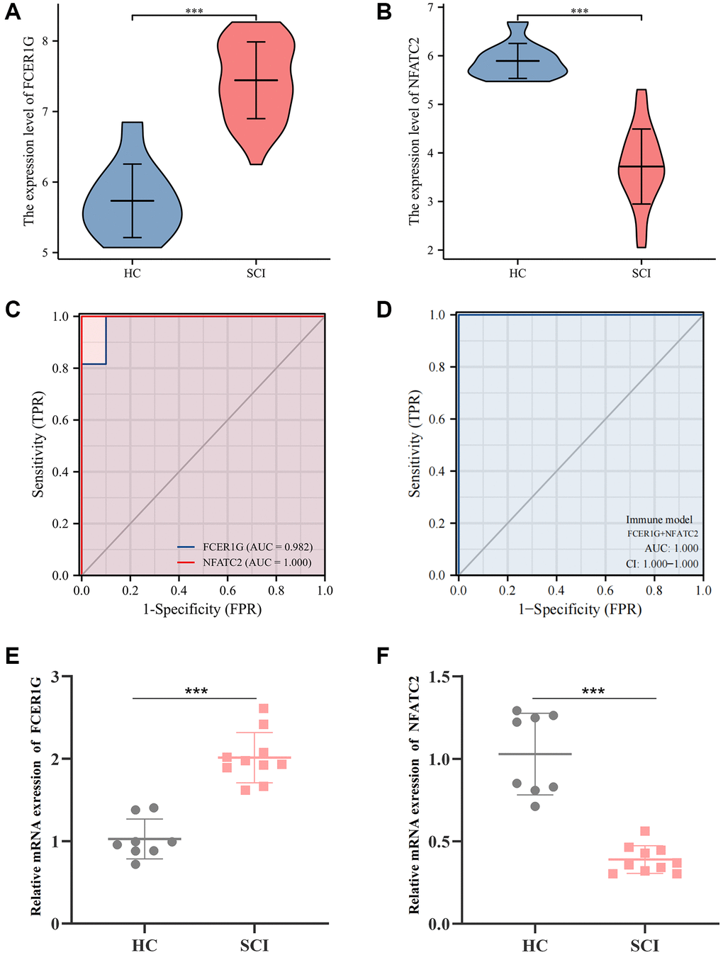 We found that the expression of FCER1G was higher in the SCI group than in the HC group in GSE151371, while NFATC2 was significantly downregulated (Figure 9A, 9B). The receiver operating characteristic (ROC) curve found that the area under curve (AUC) values of FCER1G and NFATC2 were 0.982 and 1.000, respectively (Figure 9C). When fitting these data to one variable, the AUC value of the ROC curve was 1.000, indicating excellent performance in predicting the occurrence of SCI (Figure 9D). Subsequently, quantitative polymerase chain reaction (qPCR) analysis was performed to further assess the expression of Core IRGs in the external validation cohort. The results showed that, compared with the HC group, the expression of FCER1G was elevated in the SCI group, while the expression of NFATC2 was decreased, in agreement with the results of the bioinformatics analysis (Figure 9E, 9F).
