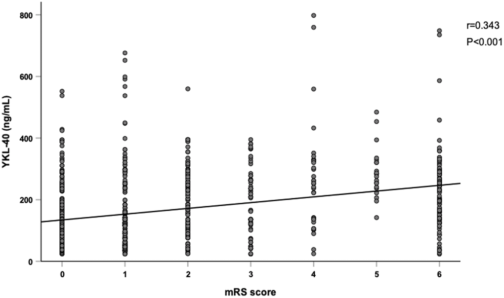 Figure 2 showed serum YKL-40 levels in different groups according to one-year clinical outcomes. YKL-40 levels were higher in patients with poor outcome (237.0 [139.5, 284.1] versus 119.6 [63.5, 193.0] ng/mL, P < 0.001), all-cause mortality (244.9 [159.1, 279.5] versus 126.7 [73.9, 230.8] ng/mL, P < 0.001), and recurrent stroke (176.2 [105.8, 258.1] versus 135.8 [81.3, 242.1] ng/mL, P = 0.013). Moreover, YKL-40 levels showed a limited correlation with mRS score at one-year (r = 0.343, P < 0.001) (Figure 3).