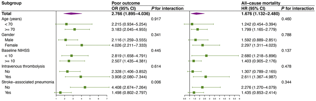 | Abbreviations: OR, odd ratio; HR, hazard ratio; CI, confidence interval; NIHSS, National Institute of Health Stroke Scale; SAP, stroke-associated pneumonia; TOAST, Trial of Org 10172 in Acute Stroke Treatment; TC, total cholesterol; TG, triglyceride; HDL, high-density lipoprotein; LDL, low-density lipoprotein; FBG, fasting blood glucose; hs-CRP, high sensitivity C-reactive protein. | |||||||||||||||||||||||||||||||||||||||||||||||||||||||||||||||||||||||||||||||||||||||||||||||||||
