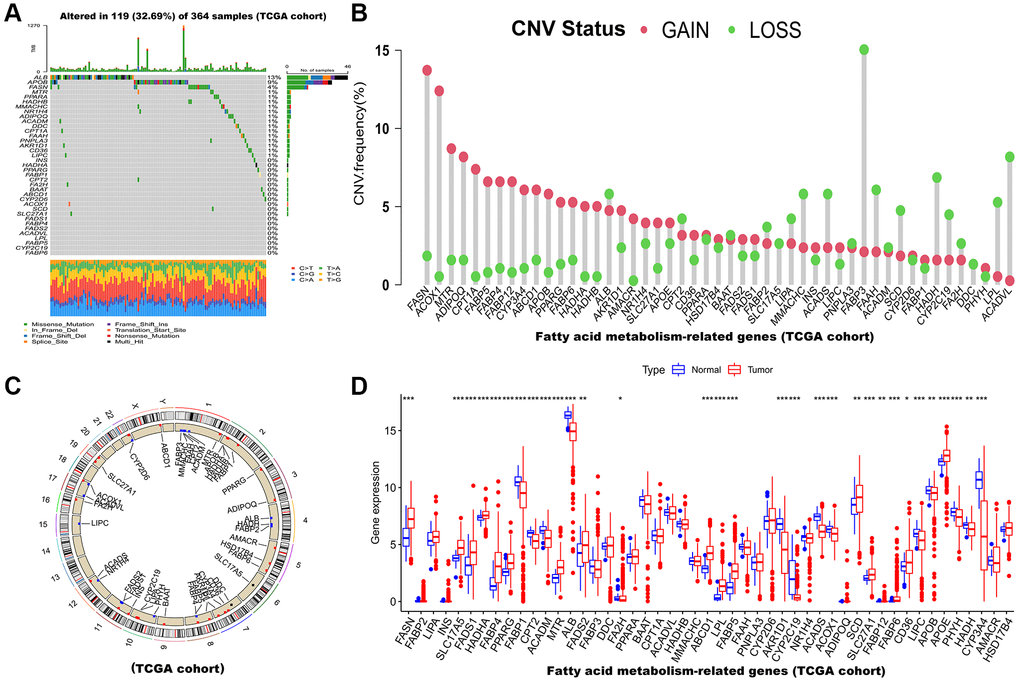 Afterward, we examined somatic copy number alterations (CNVs) in these 49 FAMs and found widespread alterations in all 49 FAMs. Among them, FASN, ACOX1 and MTR showed increased CNVs, while FABP3, ACADVL, HADH, FAAH, and ACADS showed decreases in CNVs (Figure 1B). The CNVs in the FAMs on their respective chromosomes were showed in Figure 1C. Moreover, a comparison of mRNA levels of FAMs was made between HCC tumor and normal tissues, and as showed in Figure 1D, most FAMs expression levels were positively correlated with CNV gain or loss and significantly different in tumor tissues. Consequently, while CNVs can be the primary cause of FAM expression changes, they are not the only factor that regulates mRNA expression [25]. Gene expression can also be affected by transcription factors and DNA methylation [26, 27]. We found HCC and normal samples have remarkably different genetic landscapes and mRNA expression levels of FAMs, indicating that FAMs may play an undiscovered role in HCC. Furthermore, Supplementary Figure 1A shows that the association between each FAM was highly correlated. Similarly, the infiltration levels of immune cells were assessed by ssGSEA algorithm and they showed high correlation in HCC (Supplementary Figure 1B). In summary, the above results indicated that FAMs are strongly correlated with HCC.