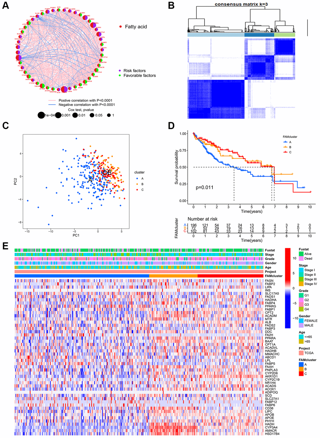 Taken together, we identified 3 FAM clusters, 2 gene clusters and established a novel 5-gene prognostic model for HCC patients. Fatty acid metabolism-related genes exhibited synergy with immune activation. We hope the prognostic model may help improve immunotherapy for HCC in the future.