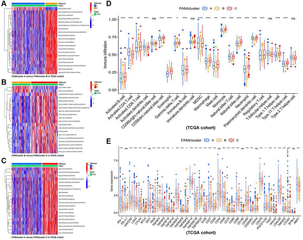 GSVA enrichment analysis was conducted among different clusters in order to identify potential biological pathways in HCC. The top 20 pathways in each cluster were visualized (Figure 3A–3C). Cluster C was significantly enriched in fatty acid metabolism pathway and immune-related pathways, such as PPAR signaling pathway, Toll-like, B cell receptor signaling pathway, Fc-gamma-R-mediated phagocytosis pathway and Nod-like receptor signaling pathway (Figure 3C). Furthermore, in order to assess whether FAMs contribute to TME of HCC, we used the ssGSEA algorithm to calculate connection between the three clusters and 23 kinds of immune cells of every HCC sample. Among the three clusters, there were significant differences in the infiltration of immune cells (Figure 3D). Besides, HCC patients in cluster A had the highest expression level of most immune checkpoints among three FAM clusters (Figure 3E), that implied an exhausted immune TME in cluster A patients.