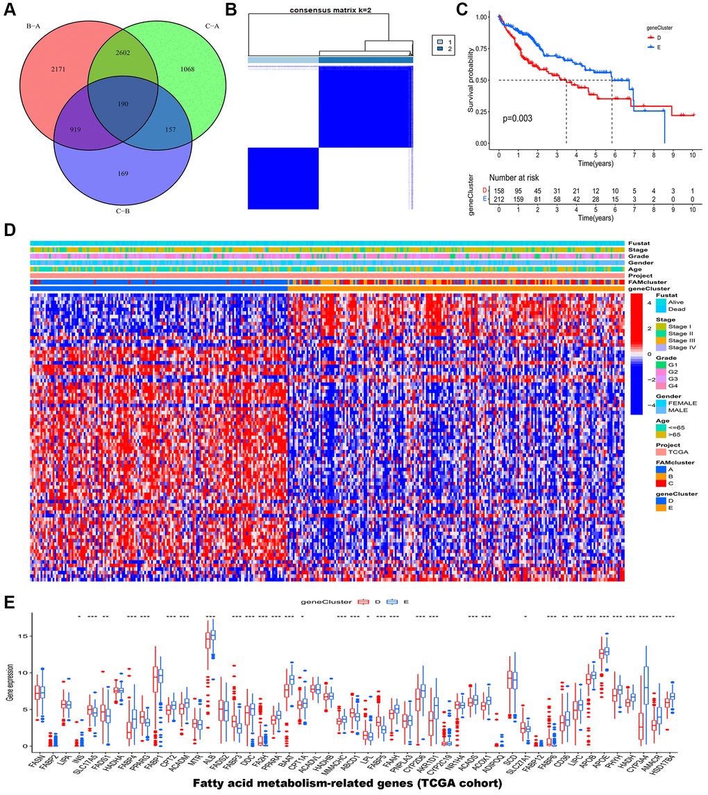 With an adjusted p-value of 0.001, we identified DEGs among different FAM clusters by the “limma” package in R. By using the “clusterprofiler” R package, we performed functional enrichment analyses on the DEGs to determine their potential functions and pathways. Furthermore, by using a method of unsupervised clustering based prognostic DEGs expression, HCC samples were classified into different clusters (FAM gene cluster D and FAM gene cluster E) for deeper analysis.