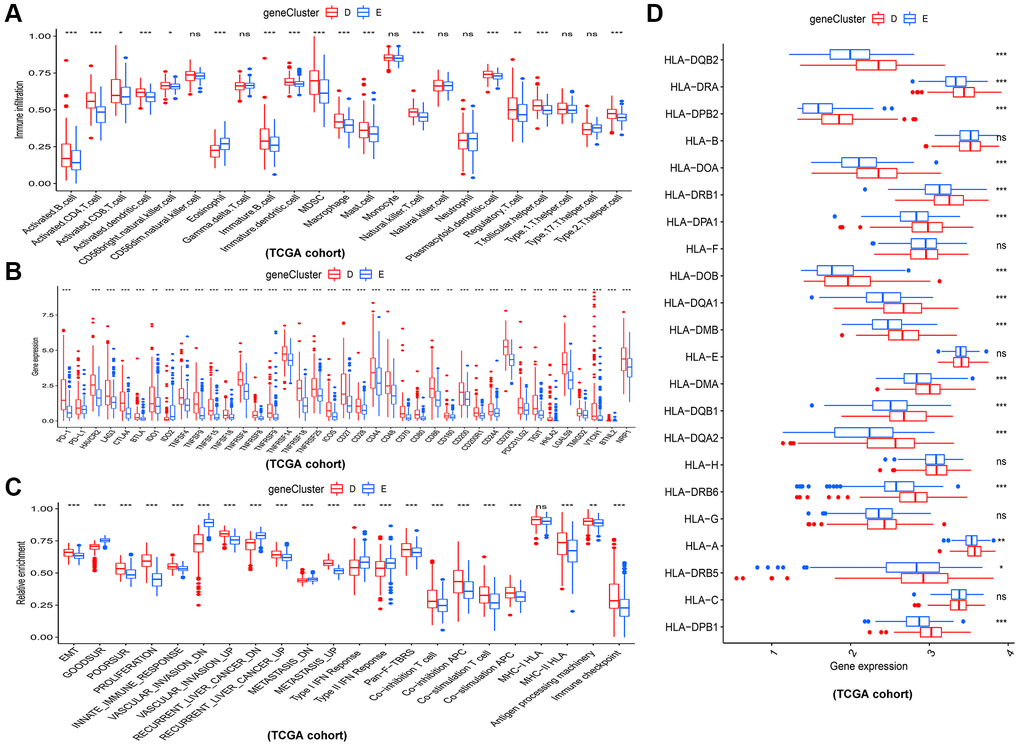 From previous literature, we gathered the gene sets for immune cells [22], and collected cancer-related gene signatures using the MSigDB. The level of immune cell infiltration and cancer-related gene signatures in the HCC tumor microenvironment were evaluated using single-sample gene set enrichment analysis (ssGSEA) [23]. As well, we compared expression levels of several immune checkpoints and HLA genes between different clusters.