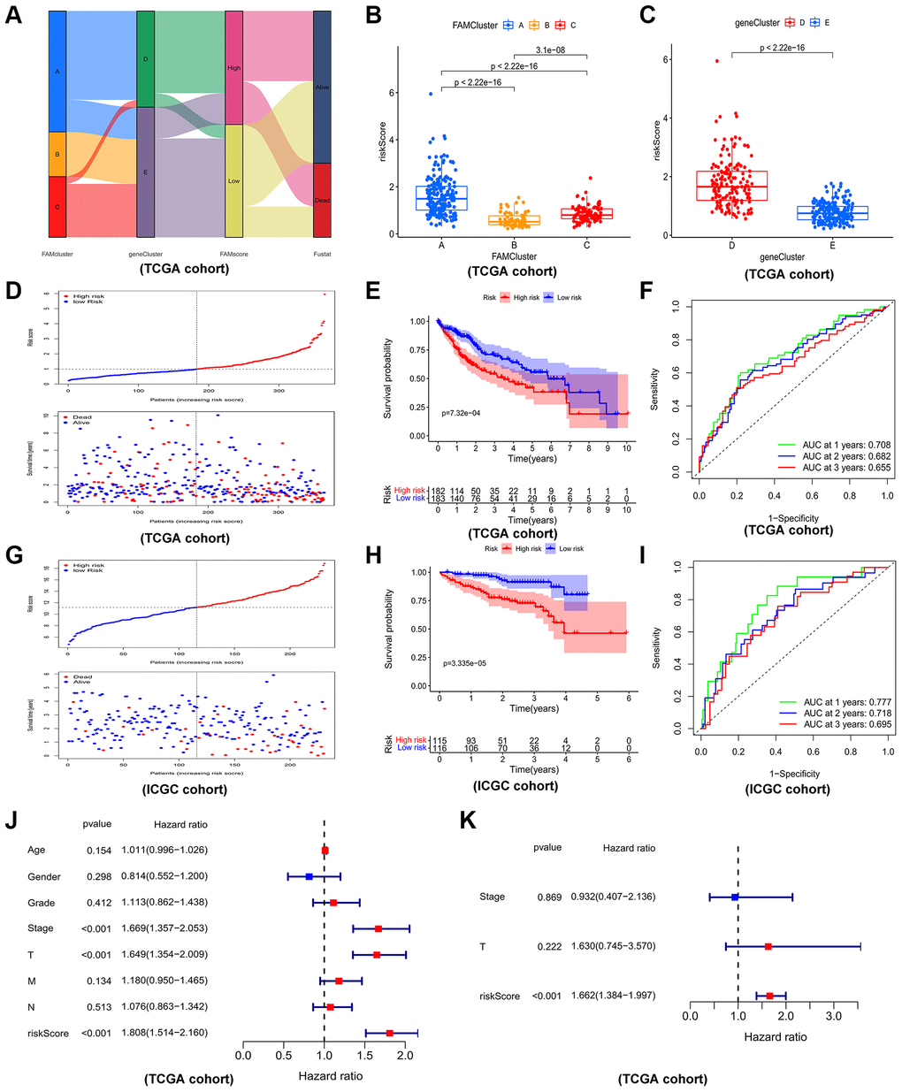 As an external validation cohort, patients in ICGC-JP (ICGC-Japan) cohort were categorized, by the median risk score, into high- and low-risk groups. Consistently, in ICGC-JP cohort, high-risk patients had worse outcomes than low-risk patients, and the corresponding AUC values of 1-, 2-, and 3-year survival rates were 0.777, 0.718, 0.695, respectively, which indicated a good efficiency (Figure 6G–6I). Furthermore, cox regression analysis, both univariate (Figure 6J) and multivariate (Figure 6K), revealed the prognostic risk model is a reliable independent prognostic factor of HCC patients.