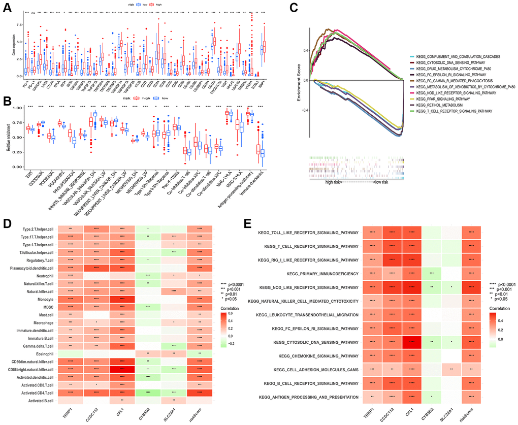 Furthermore, the relationship between five genes in the model and immune cells was analyzed (Figure 7D). We observed that three high-risk genes (CCDC112, TRNP1 and CFL1) were significantly positively correlated with most immune cells, whereas significant negative correlation was observed between two low-risk genes (CYB5D2 and SLC22A1) and infiltration of immune cells. Consistently, Figure 7E displayed the result of correlation between five genes, risk score and immune related pathways.