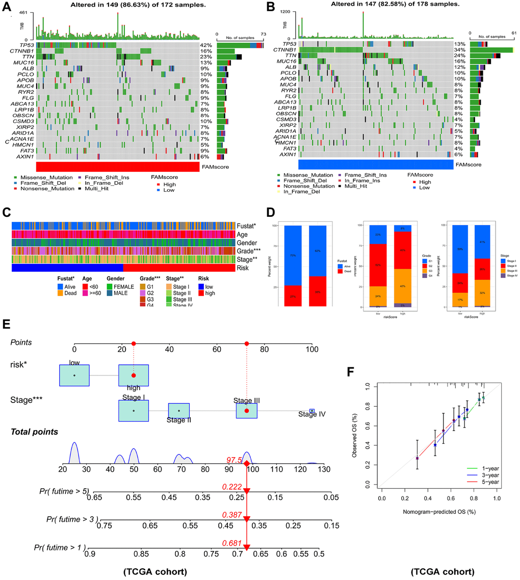 Comparison of genes mutations between the two risk groups revealed that high-risk patients had significantly higher mutation rates of TP53, MUC4, FLG, CSMD3, ARID1A, FAT3 than low-risk patients (Figure 8A, 8B). Moreover, high-risk HCC patients were remarkably associated with worse outcome, more advanced tumor stage and worse pathological grade (Figure 8C, 8D). To identify the reliability of this risk model in HCC patients, the prognostic nomogram plot containing the risk score and stage was constructed in TCGA-LIHC cohort (Figure 8E). Furthermore, calibration plot indicated excellent agreement between prediction and actual risk (Figure 8F). Overall, the risk model showed good prognostic value in HCC samples.