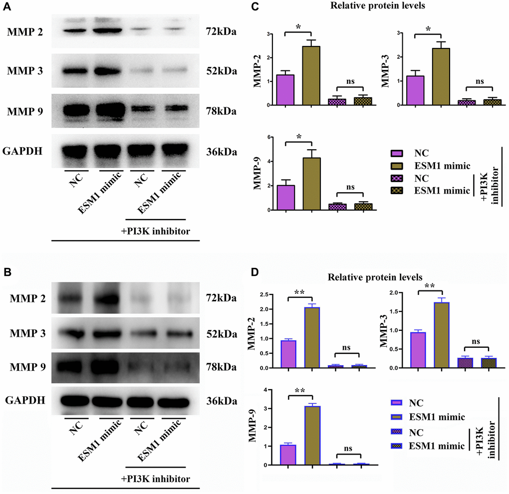 The results of wound healing assay manifested that ESM1-mimic group had a significantly smaller width of cell scratch than ESM1-NC group at 24 and 48 h, indicating that the distance of tumor cells migrating to the scratch center rose notably (Figure 1A, 1B). On the contrary, the width of cell scratch in ESM1-inhibitor was distinctly larger than that in ESM1-NC group. Similarly, the results of Transwell assay indicated that, compared with that in ESM1-NC group, the number of migrating SW480 and SW620 cells and basement membrane-penetrating cells was increased markedly in ESM1-mimic group (Figure 1C, 1D). Consistently, Western blotting revealed that in contrast to those in ESM1-NC group, the protein expressions of MMP-2, MMP-3 and MMP-9 were overtly elevated in ESM1-mimic group. The above findings suggest that ESM1 can enhance the migration and invasion abilities of CRC cells (Figure 2A–2D).