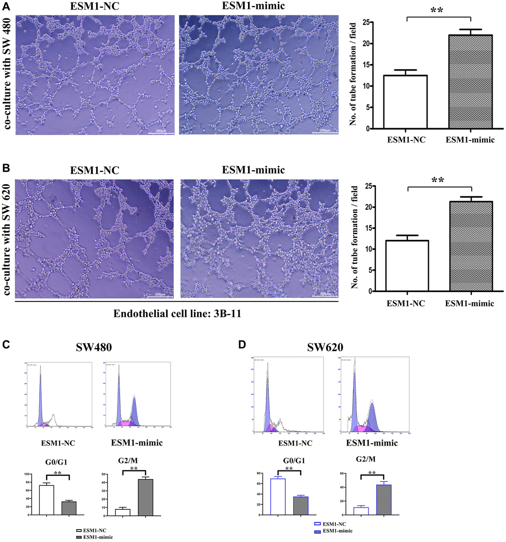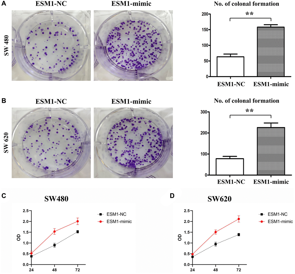 Through Q-PCR detection, we found that the relative expression of ESM1 in the ESM1-mimic group was significantly higher than in the ESM1-NC group in sw480 and sw620 cells. Successful transfection of ESM1 in the ESM1-mimic group was described (Supplementary Figure 1A, 1B).