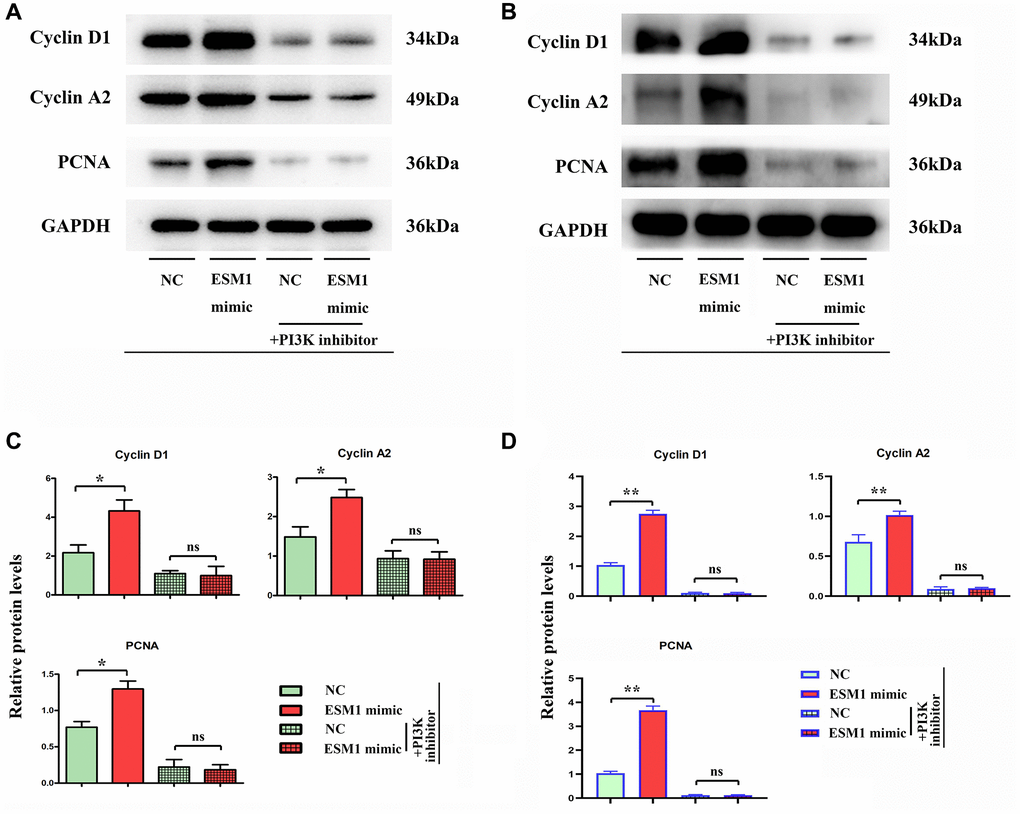 The results of colony formation assay showed that the number of colonies formed by SW480 and SW620 cell lines was raised after ESM1 overexpression in vitro, indicating that ESM1 can enhance the proliferation ability of CRC cells (Figure 3A–3D). It was found by MTT assay that the relative viabilities of SW480 and SW620 cells could be enhanced by ESM1-mimic. Furthermore, the alteration of proliferation-related protein expressions in SW480 cells was determined by Western blotting, and it could be seen that the protein expressions of Cyclin D1 and Cyclin A2 in SW480 and SW620 cell lines were remarkably higher in ESM1-mimic group than those in ESM1-NC group (Figure 4A–4D), indicating that ESM1 overexpression can enhance the proliferation ability of CRC cells.