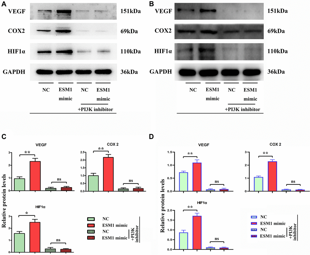 The results of tube formation assay denoted that compared with that in ESM1-NC group, the number of angiogenesis rose in ESM1-mimic group but notably declined in ESM1-mimic + PI3K inhibitor group, indicating that the supernatant of SW480 and SW620 cells with ESM1 overexpression can promote angiogenesis in 3B-11 cells (Figure 5A, 5B). Through flow cytometry, it was found that ESM1-mimic could increase the number of G2 phase cells. It is explained that ESM1 can promote the proliferation ability of SW480 and SW620 cells (Figure 5C, 5D). Consistently, the results of Western blotting implied that in comparison with those in ESM1-NC group, the protein expressions of VEGF, COX-2 and HIF-1α were prominently raised in SW480 and SW620 cells in ESM1-mimic group (Figure 6A–6D). These findings elucidate that ESM1 can promote angiogenesis in CRC.