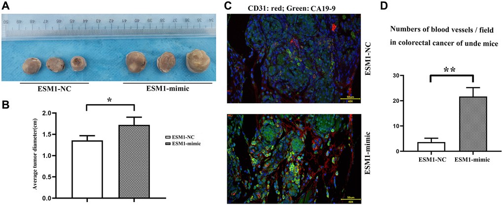 As shown in Figure 8C, CA199 expression is FITC-labeled green, CD31 expression is Alexa Fluor® 647-labeled red, through observation, we can clearly find that compared to ESM1-NC, ESM1-mimic represents colorectal cancer cells CA199 and CD31 representing blood vessels are significantly elevated (Figure 8C, 8D).