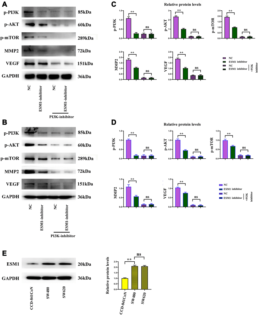 The complementary Western blotting assay verified that the expression of ESM1 was indeed elevated in CRC cells. The protein expressions of p-PI3K, p-Akt, p-mTOR, MMP-2 and VEGF in ESM1-NC group were significantly higher than those in ESM1-inhibitor group, and the protein expressions in ESM1-NC group and ESM1-inhibitor group were inhibited after the addition of PI3K inhibitor (Figure 9A–9D). And the expression of ESM1 in SW480 and SW620 was significantly higher than that in CCD-841CoN (Figure 9E). This illustrates that ESM1 may affect the proliferation of CRC cells through the PI3K/Akt/mTOR pathway (Figure 10).