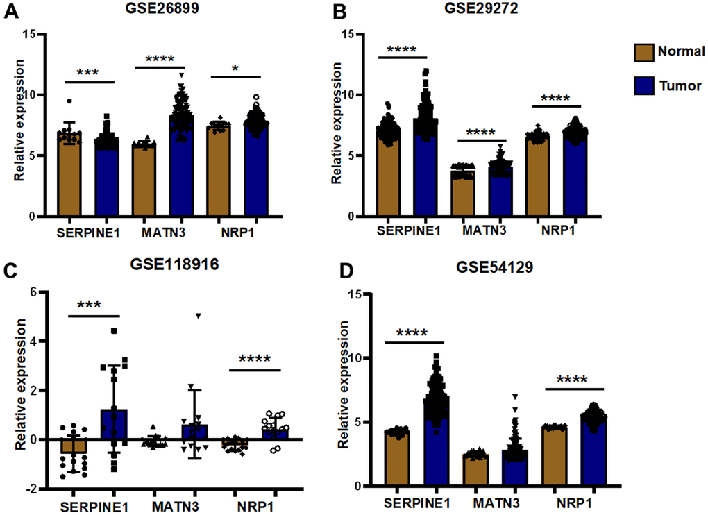 We performed expression pairwise analysis of 12 risk genes and survival curve analysis, at which point we found that MATN3, NRP1 and SERPINE1 were highly expressed in the tumour tissue and their high expression group had significantly lower survival rates, while the rest of the genes had conflicting expression data and survival analysis results (Figure 9A, 9B). For more precise study of specific gene, we selected four gastric cancer expression datasets from the GEO database for screening (GSE26899, GSE29272, GSE118916 and GSE54129). The results in Figure 10 show that MATN3 was not significantly differentially expressed in the datasets GSE118916 and GSE54129 (Figure 10C, 10D), while SERPINE1 was highly expressed in normal tissues in the GSE26899 dataset (Figure 10A, 10B), so we finally selected NRP1 as the final study target.